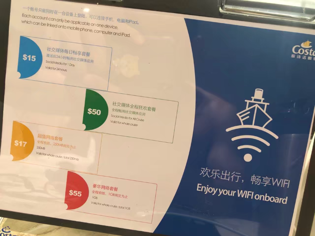 如果想使用其他app只能购买邮轮上的网络套餐,一个账号只能同时在一台设备上登陆,可以连接手机、电脑和ipad。所以如果不是有必要的网络需求,用船上wifi连接支付宝就完全可以满足基本需求了,最最关键的就是,登船前打开支付宝互相添加需要联系的好友就不会失联了。
