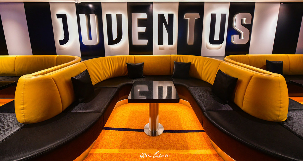 穿过尤文图斯博物馆是青少年俱乐部,进去就看到沙发背墙上硕大的尤文图斯logo