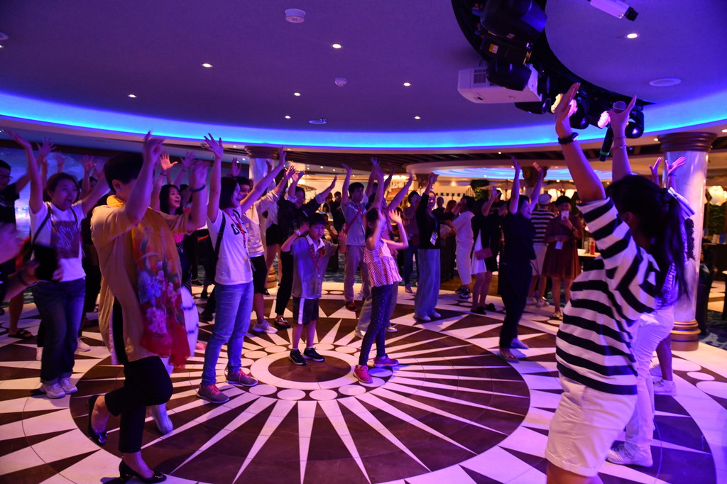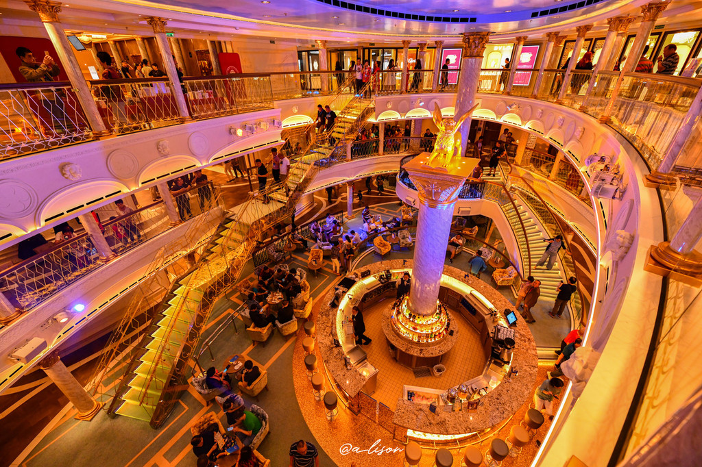 除了5楼贡多拉酒吧区域,还有10楼丽都集市餐厅里泳池前的舞台区域也是有杂技表演~~登岛日的前一天晚上,在3楼的圣马可大堂有金色派对,跟着DJ一起跳起来也是一项不错的减肥运动