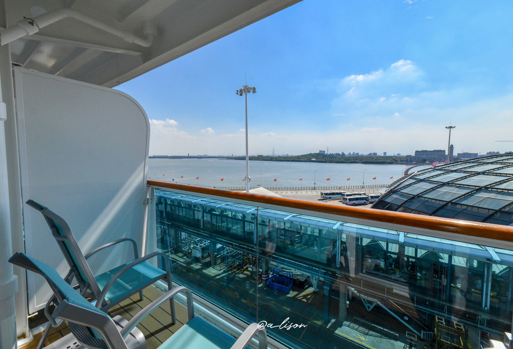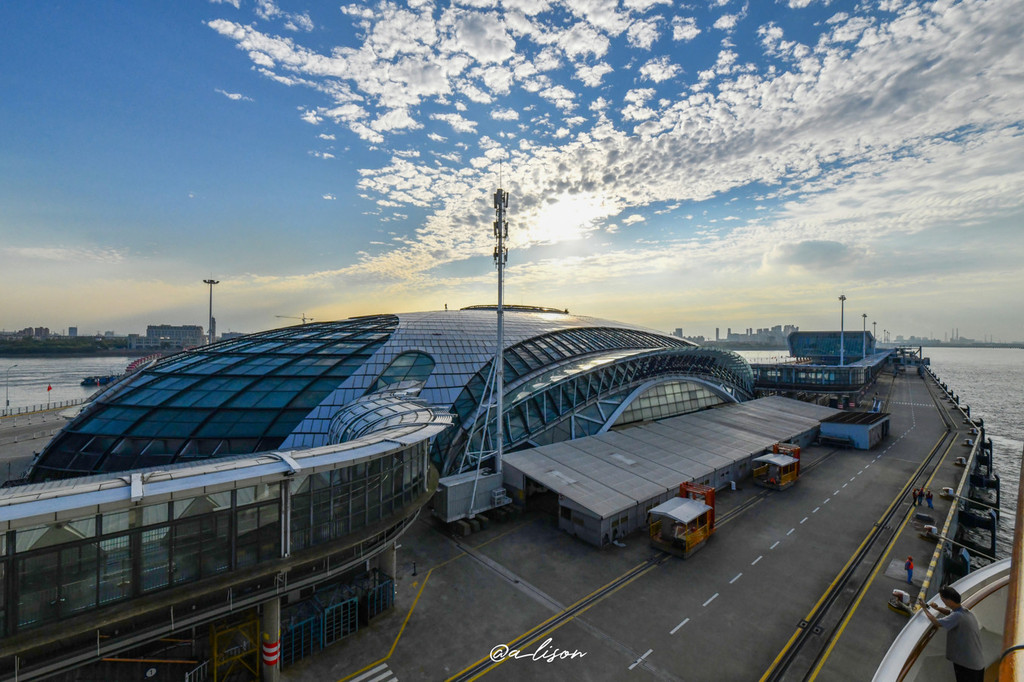 出发前我站在房间阳台上看吴淞口国际邮轮港。临开船前太阳渐渐西下,云也渐渐多了起来