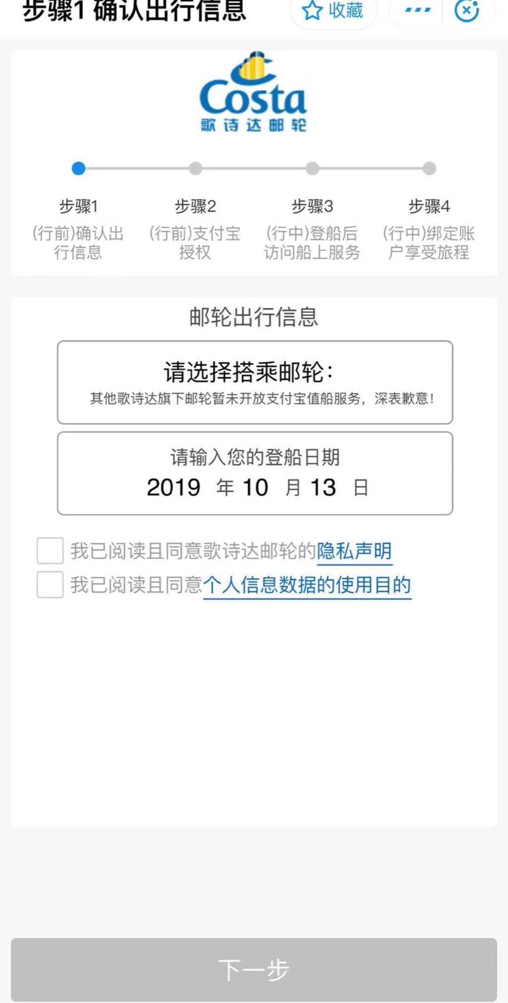 选择自己对应的搭乘信息填入即可绑定,在拿到船上的房卡前可以进行到步骤2。拿到房卡后可以进行步骤3和步骤4,具体看下面?