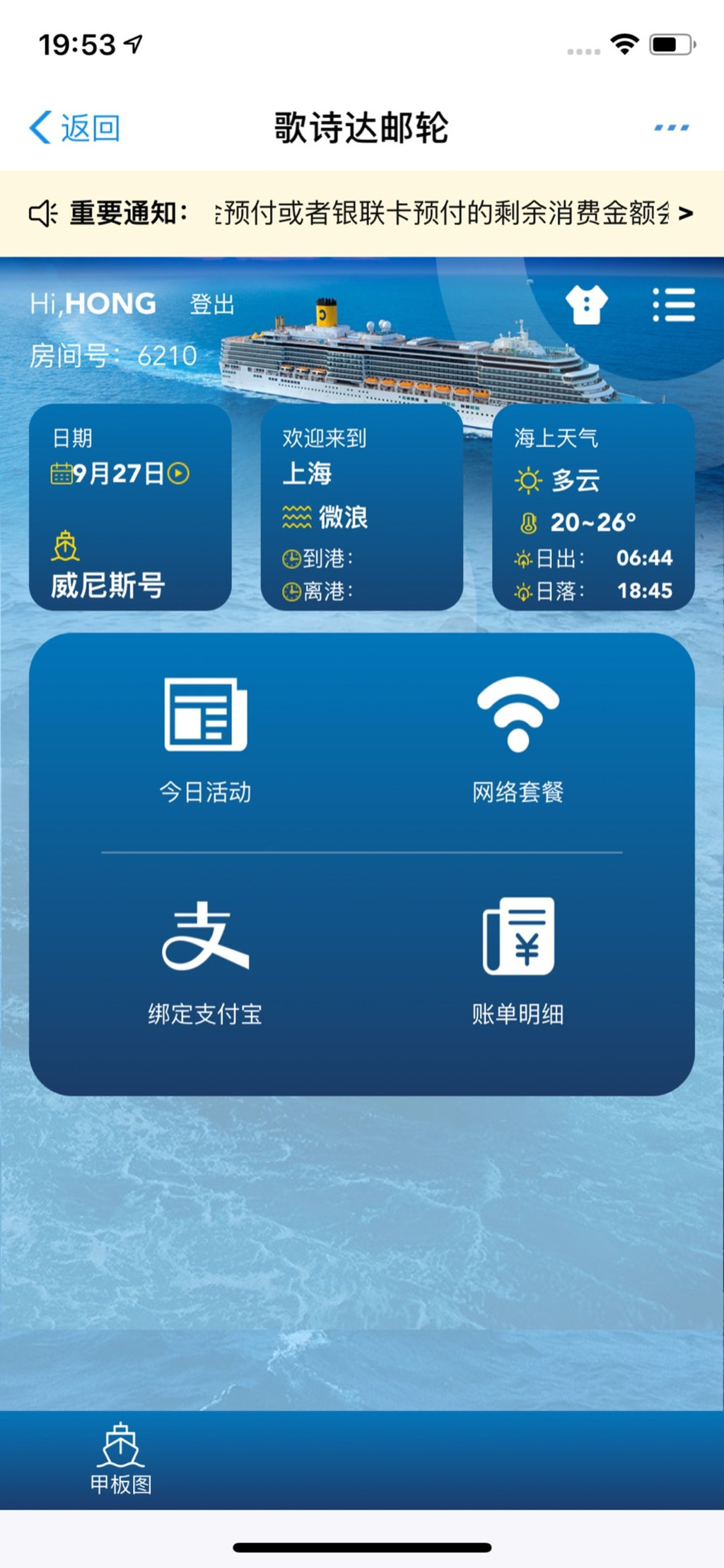 同时之后在行程中想了解每一处的开放时间和船上各项活动具体情况,都可以用支付宝扫描船卡正面二维码查询,如果想知道日出日落时间也是可以扫出来方便带相机拍摄日出。想了解账单明细也可以通过扫码在主页查看。