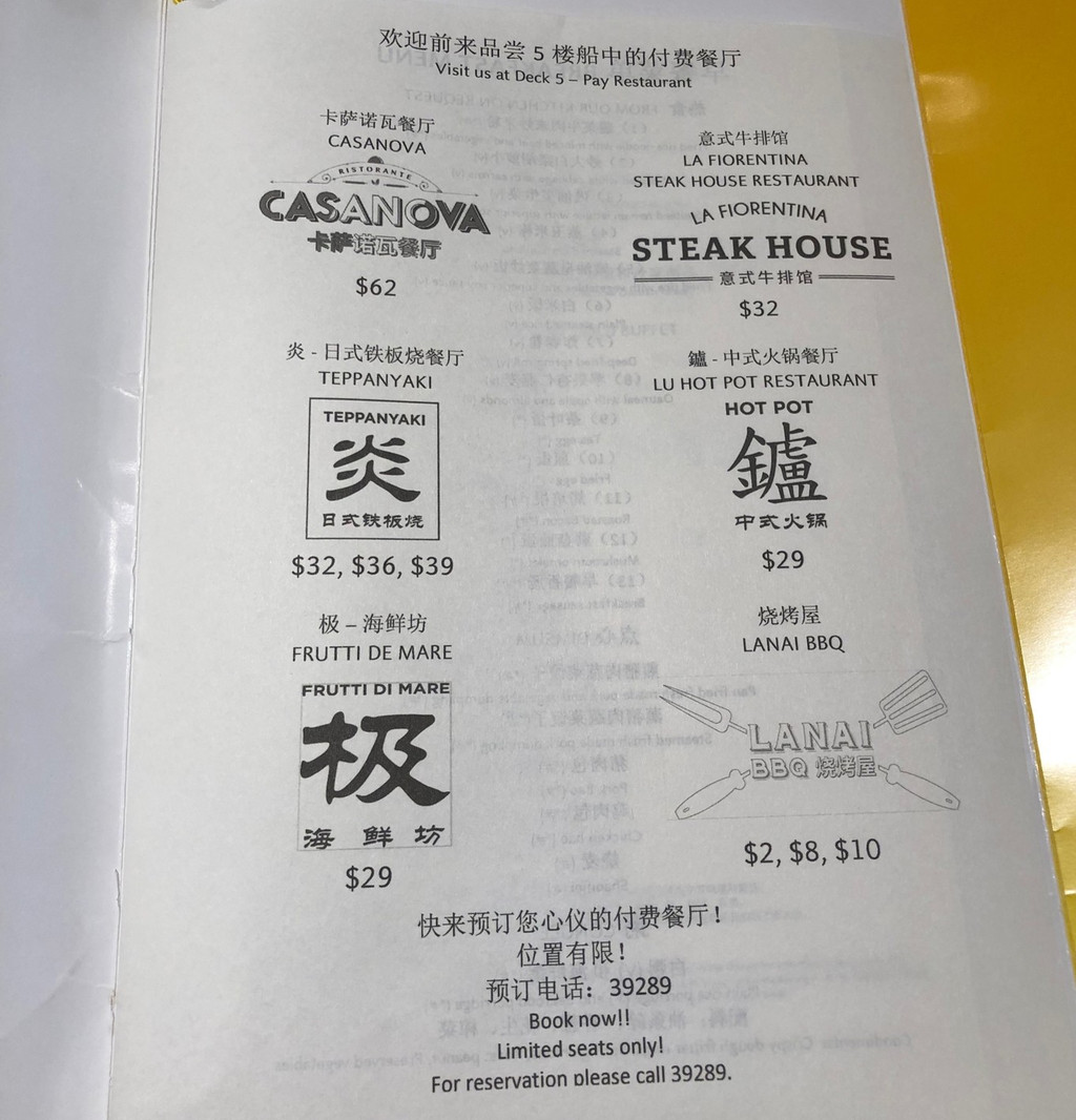 船上付费餐厅:5楼船中的卡萨诺瓦、意式牛排馆、极海鲜坊、炎日式铁板烧、鑪中式火锅以及烧烤屋,10楼船尾还有意式披萨,可以按需品尝~~记得提前预约喔!~
