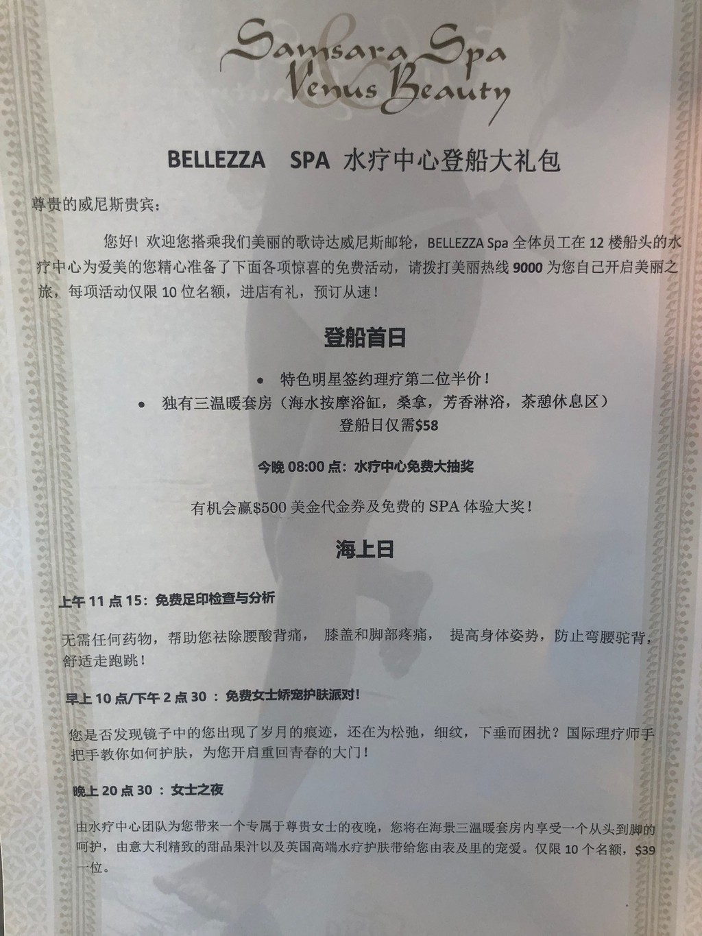 当天进房间就看到桌上宣传单。当天船上12楼船头Bellezza Spa有登船活动~不过我没去体验,如果你感兴趣可以试试