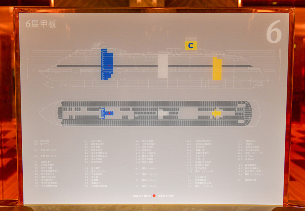 附船上的各楼层区域信息,没错我在6楼电梯口拍的。接下来开始邮轮海上之旅~