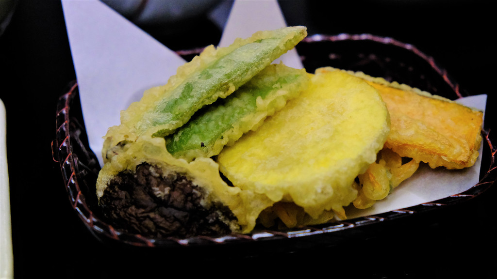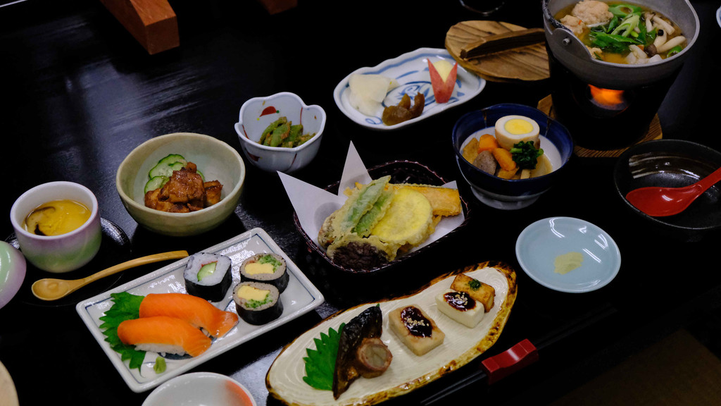 住在这样古朴的都和式旅馆,最让人期待的就是餐食。这里提供的也是本地出产食材制作的传统美食,很让人期待。无论是鱼的甘露煮还是寿司,都是在山里捕获的食材,包括野生鳟鱼,非常原生态。天妇罗的芋头和南瓜都很甜,下面竟还藏着柿饼天妇罗,很是惊艳,以柿饼入菜天妇罗还是很少见的。