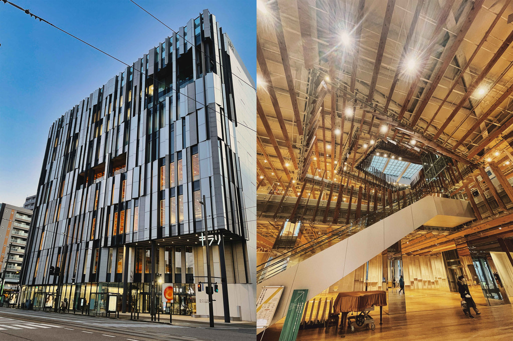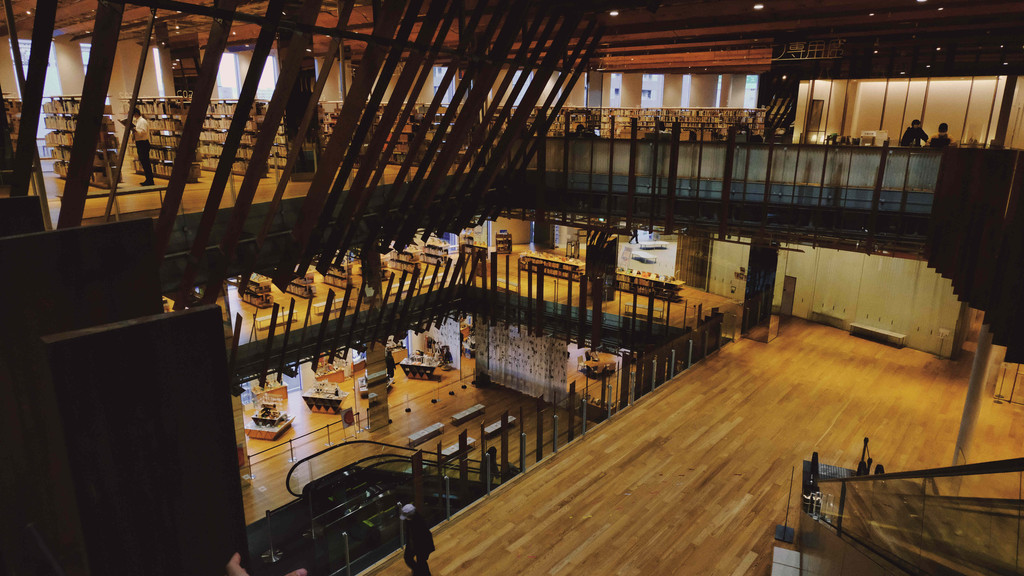 富山市玻璃美术馆和富山市立图书馆是共存于同一栋楼的两个部分,图书馆和玻璃展出相存相依,有书又有展览。整个建筑由著名建筑设计师隈研吾设计。图书馆本身就是一个艺术的殿堂,从二楼仰望整个图书馆和玻璃美术馆,艺术和创作的细节一一被体现了出来,从外至内都能够感受到艺术气息。