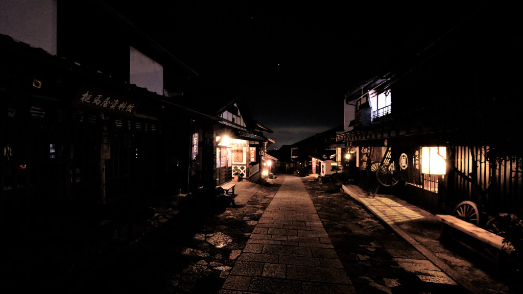 在马笼宿,大多只在白天观光,入夜后的街道空无一人。即使是观光咨询所,到了晚上也是一片漆黑。吃完晚饭想去小街上散散步,呼吸一下新鲜空气,才发现夜晚也有它独特的美。各家的门灯映在石阶上,周围只有流水声,星星也渐渐崭露头角,闪着浪漫的光,让我这个异乡人,能在此刻独占寂静的夜,突然感觉很是幸福。