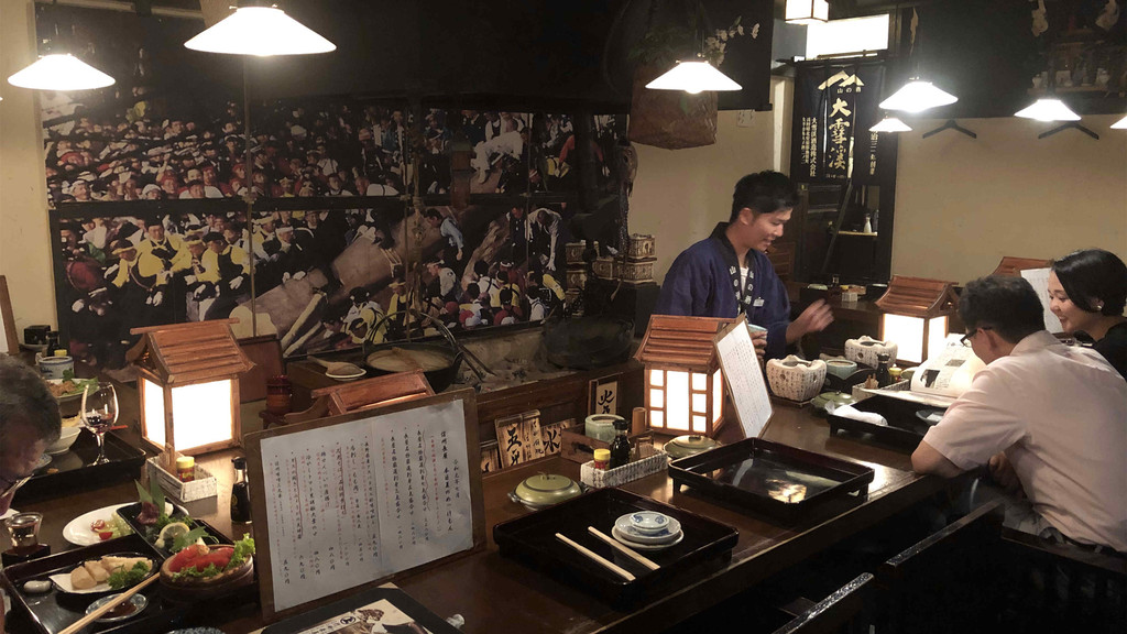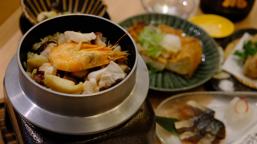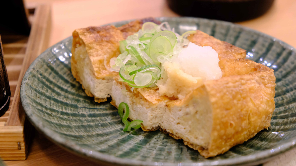 永平寺的银杏是下酒恩物,只有盛产美味海鲜的福井才有的海鲜菜饭必须安排上,福井县北部的大野町是芋头的产地,带着丝丝甜味的炸芋头很受欢迎;福井县竹田村的厚豆腐虽然很朴素,外焦里嫩的油炸豆腐很有口感;酒也是店主推荐的日本酒“黑龙”大吟酿,味道干净利落,能衬托出料理的味道,也是在永平寺地区制造的本地酒。