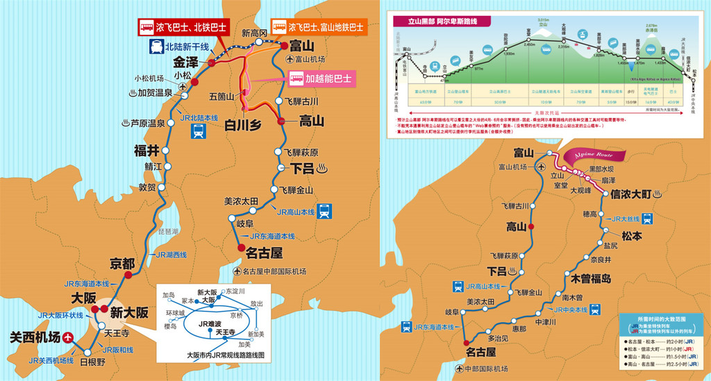 在日本自由行,强烈建议使用JR周游券,日本的车站站名大多是汉字,搭车简便、省心,日本的火车是出了名的准时,乘火车自由行,靠谱儿!这次行程的目的地,使用“高山、北陆区域周游券”和“立山黑部、高山、松本区域周游券”的通票都能去到哦,且在有效期内可无限次乘坐。像这种专为外国游客量身定制的羊毛,真的不薅白不薅!