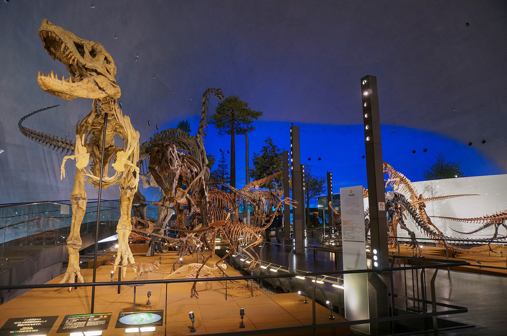 宽阔的展厅内没有使用任何支柱,里面放满了各式各样的恐龙骨架、化石标本、重现远古时代的实景模型等等。其中福井盗龙与福井猎龙的两种兽脚类、福井龙与越龙的两种禽龙类、蜥脚类的福井巨龙、以及鸟类的福井之翼,是发现的骨骼较为完整并已冠上学名的种类。除此之外,此挖掘场每年都有新发现,例如似鸟龙类的骨骼、装甲龙类与棘龙类的牙齿等等。这里是亲子游不能错过的重要项目,时间允许的话,带孩子在这里畅游一天也是完全可以的,馆内逼真生动的恐龙机器人最受孩子们的欢迎。