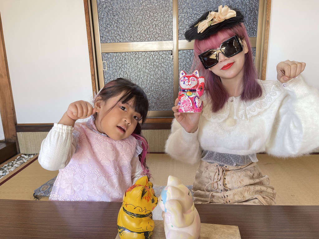 而在土管坂休憩所,悦奈和宝宝还在陶艺教室体验了给招财猫上色。这里有两种选择,一种是用马克笔绘画好了可以直接带回家,另一种是水彩画完后烧制后邮寄到家里。招财猫分三个尺寸价格不一样、可以选择自己想要的大小。也是而非常适合亲子游的项目呢。