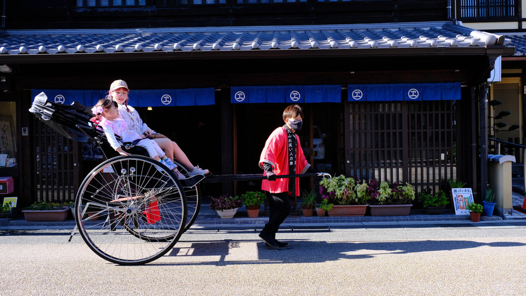 到了犬山城,必不可少的,还要到各种小吃琳琅满目的犬山城下町散步。悦奈和宝宝在这里体验了人力车,拉车的小伙子讲话非常有趣,不光是坐车体验了风景,还能和当地人的对话,也是一种体验当地风土人情的方式,大人和孩子都很开心!