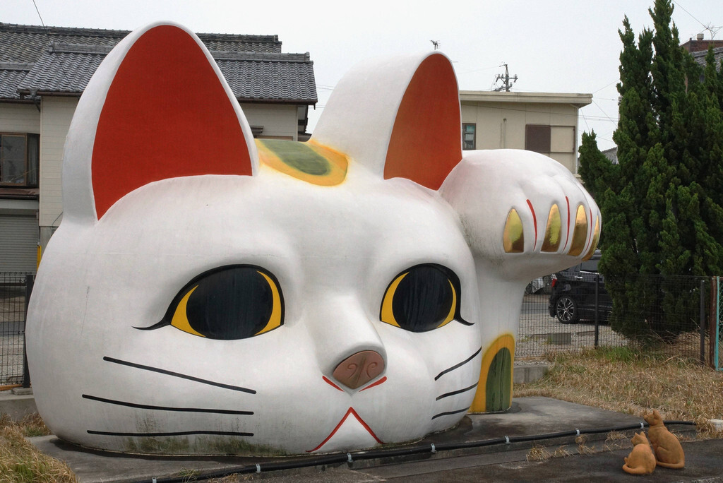 陶器街上布满形态各异的陶器,其中有个巨大的常滑招财猫“tokonyan”,最为引人注目。它在一个人行天桥的旁边,不能接近拍照,招财猫前面还有两只通常大小的猫咪的雕塑,逼真得可以以假乱真,这样的设计巧思非常可爱。