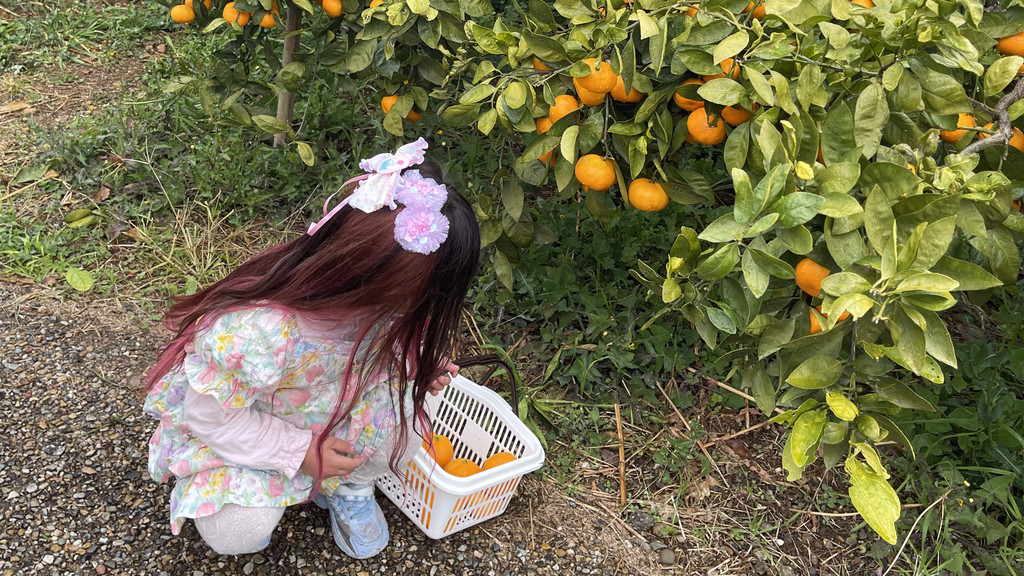 在这里,悦奈和宝宝体验了人生第一次摘橘子。摘之前,向导会给大家发放一些采摘工具,篮子、剪刀,并会教大家如何剪下橘子放进篮子。最有趣的是,这里是按重量算价格的,摘了多少就付多少钱,旁边有个小亭子,可以在亭子里吃橘子,十分惬意,宝宝非常开心。