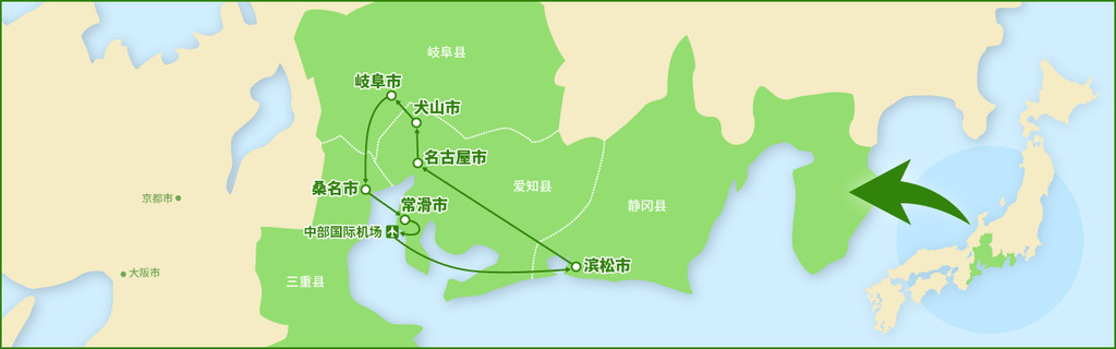 京都和东京是日本传统文化与现代都市的两大代表,而在它们中间,还有古韵浓厚而不失前卫的历史名城名古屋、YAMAHA的故乡音乐之城市滨松、伊贺忍者的故乡三重,以及拥有中部空中枢纽的陶器之乡常滑。