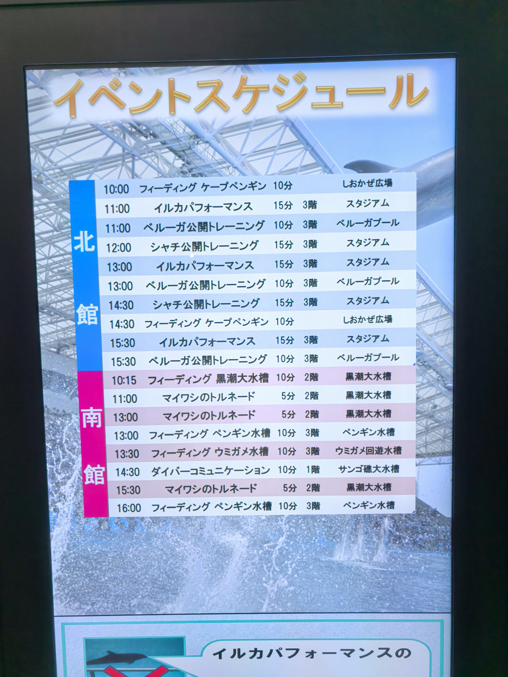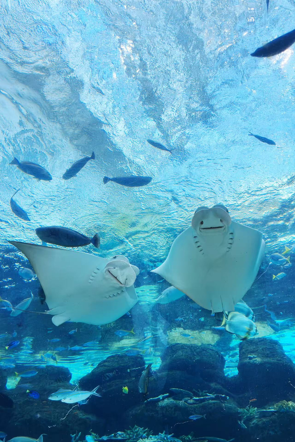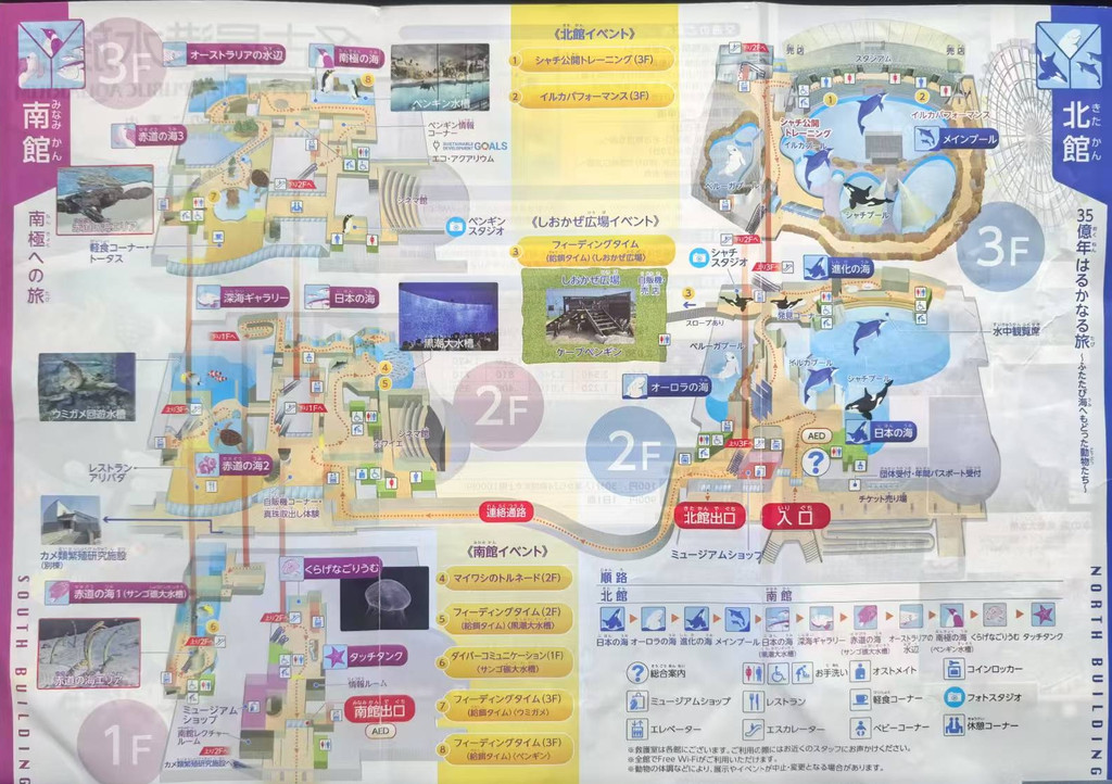 南馆以“南极旅行”为主题。沿着南极观测船“富士号”的南极路线,再现了“日本之海”、“深海”、“赤道之海”、“澳大利亚”及“南极之海”五个水域的生物生长的自然环境。北馆以“35亿年追溯旅行”为主题。设有“大洋”、“日本之海”、“极光之海”、“进化之海”和“海风广场”五个区域。饲养并展示海豚及白鲸等大型海洋哺乳动物。