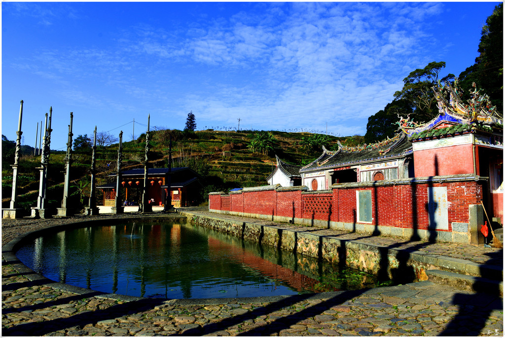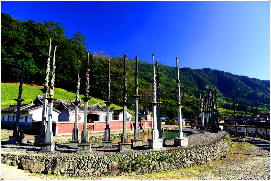 德远堂前是一口半月形的池塘,塘前两侧耸立着24根10多米高的石龙旗杆,此为中国现存石龙旗杆之最。