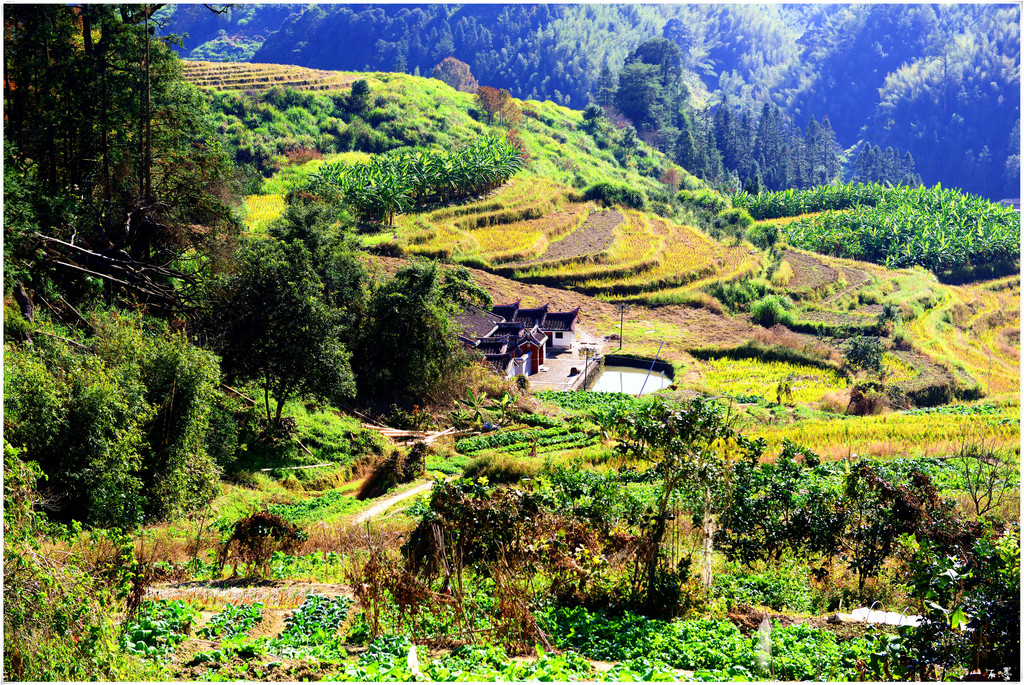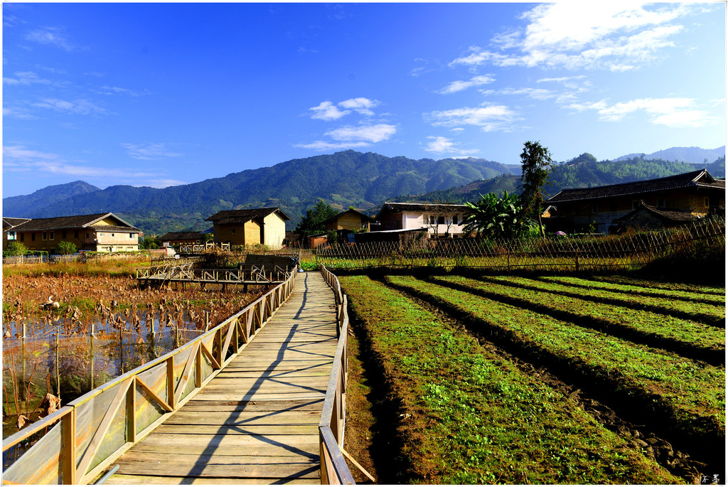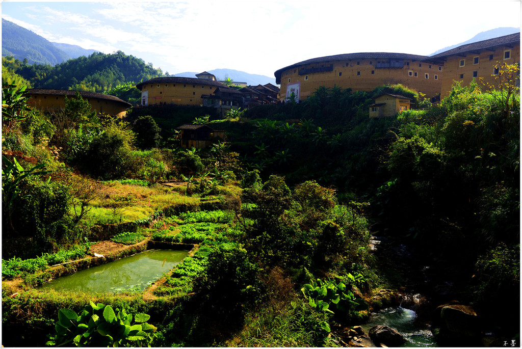 村落四面环山,溪流伴村,沿着悠长的田间小路缓步走进村中,一座座土楼映入眼帘。