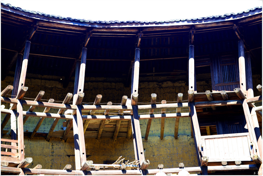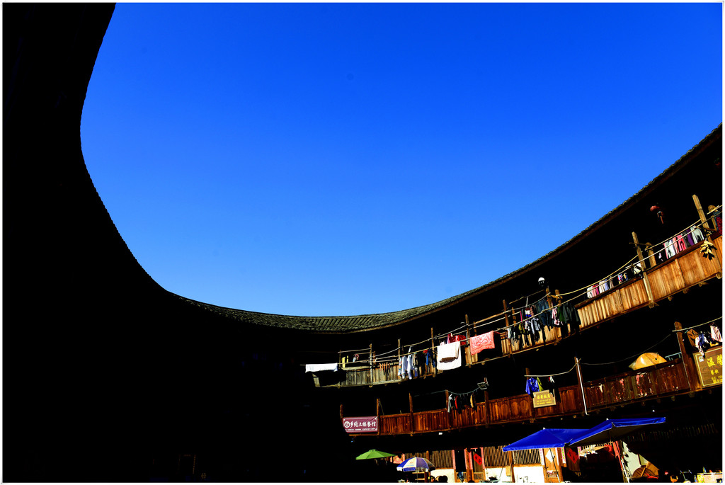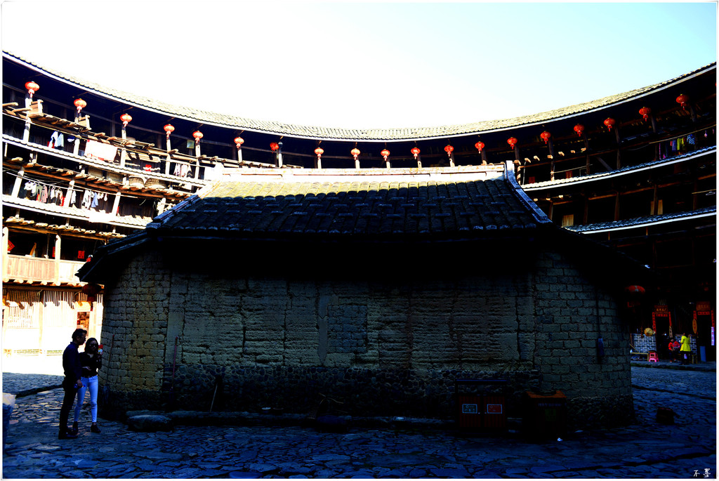 整个承启楼直径达73米,共三环主楼,环环相套,包围着最中心位置的祖堂,全部房间达400间,最多时曾经居住800余人。登楼探望,的确很壮观,也很震撼,俨然一座森严的城堡,不愧“土楼王”、“家族之城”的称号。
