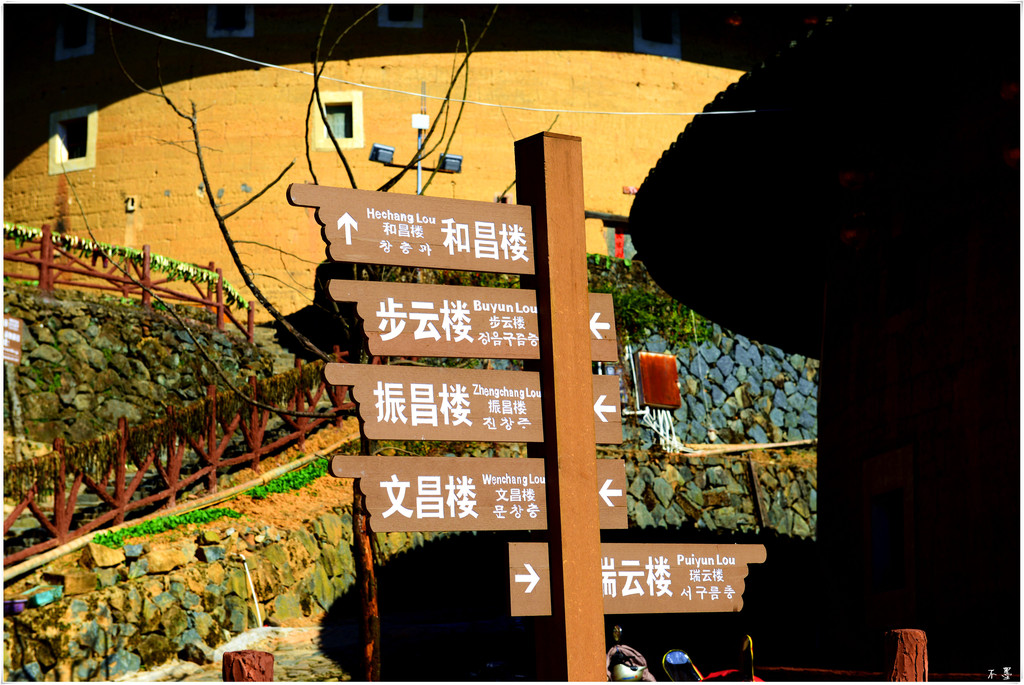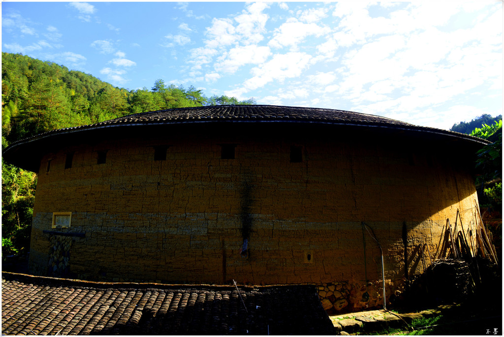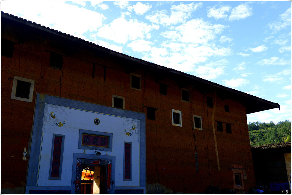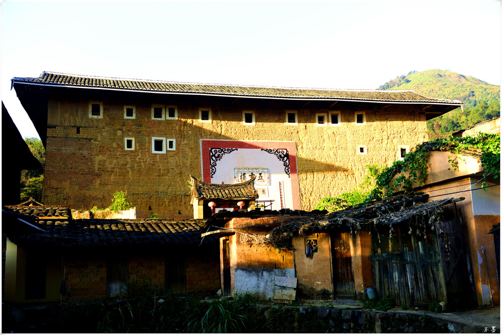 村外的山坡上有个观景台,俯瞰整个村子,一栋栋土楼或圆或方散落在溪流边,古朴典雅、神秘优美,构成一道美丽的风景。而穿插其中的个别新楼,则显得有些突兀。在这里,相比新式住宅,土楼看起来更具观赏性,与这里的山水也更协调。我觉得:像这种地方应该有个统一规划,把以前的土楼划归一个区域加以保护,新建的住宅可以重新划定单独一个区域,而且新建的住宅和土楼的风格应一致。这样才能做到保护古建与发展新村并行不悖。