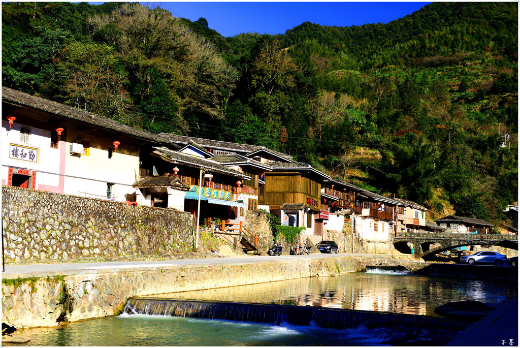 村外,一条小溪盈绕。村中,一座座土楼依山就势,错落有致。