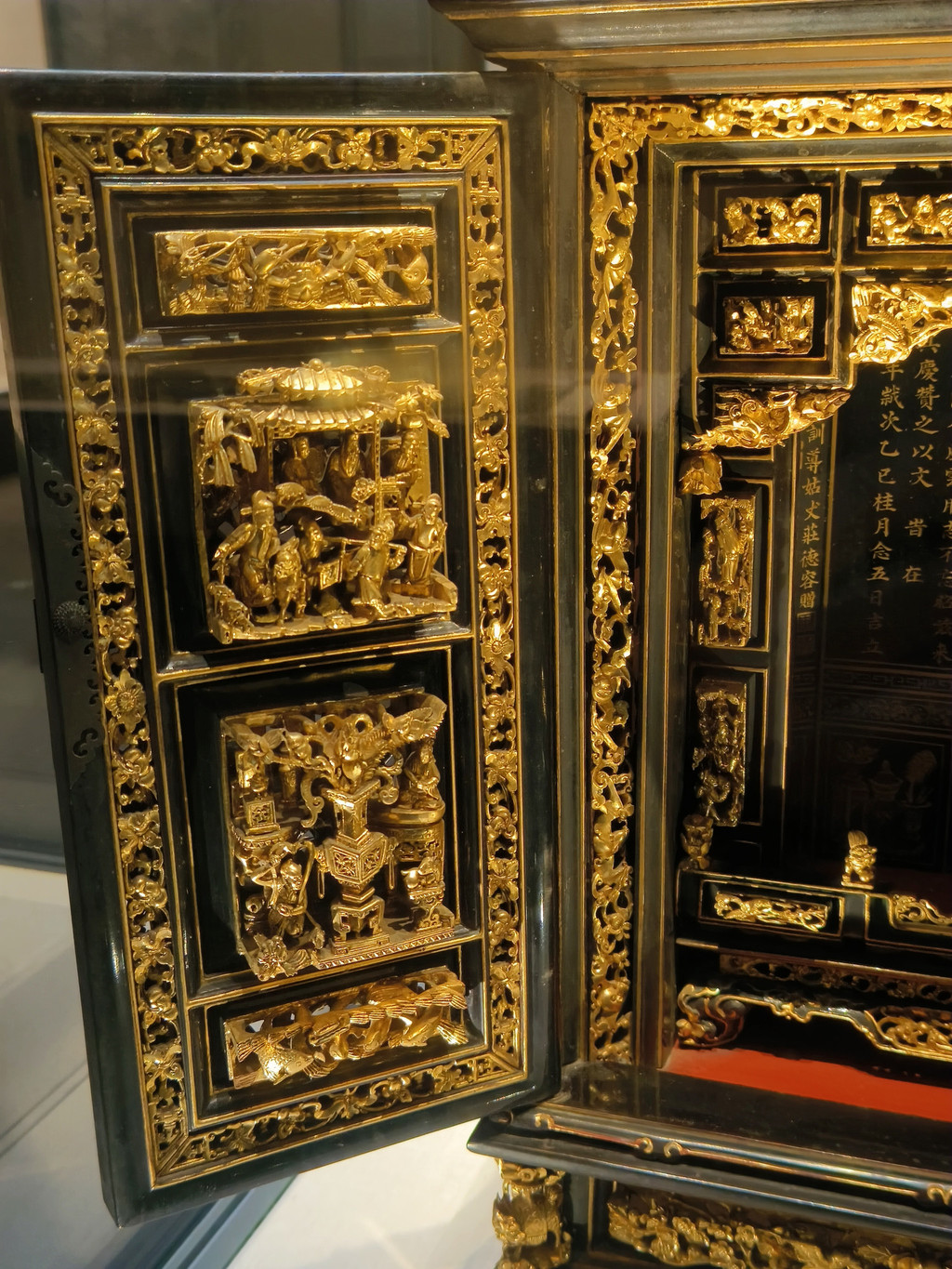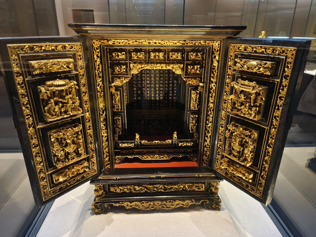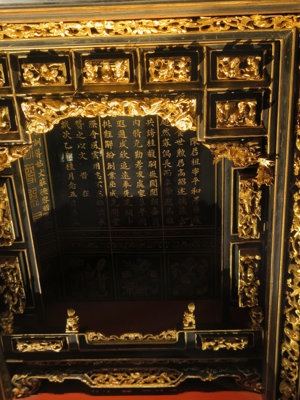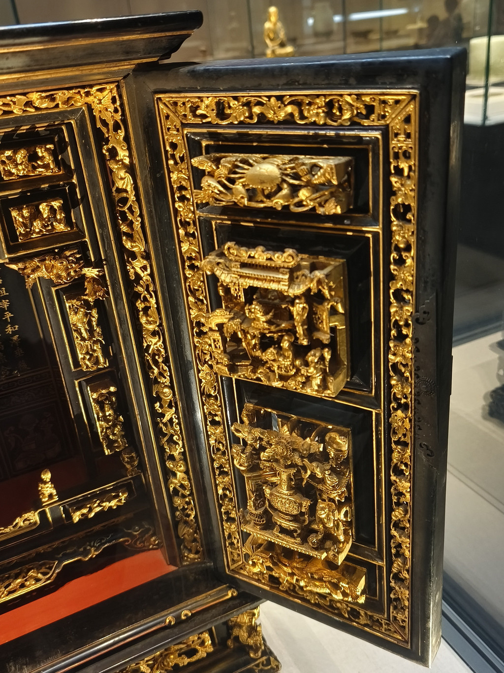 ↗金漆木雕人物博古纹神椟(清)。国家一级文物,镇馆之宝之一。神椟是潮汕地区供奉祖先牌位的一种神龛,多为柜式,大的称“龛”,小的称“椟”。这是迄今有明确纪年、年代最早的一件潮汕木雕神龛。