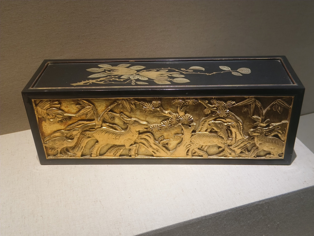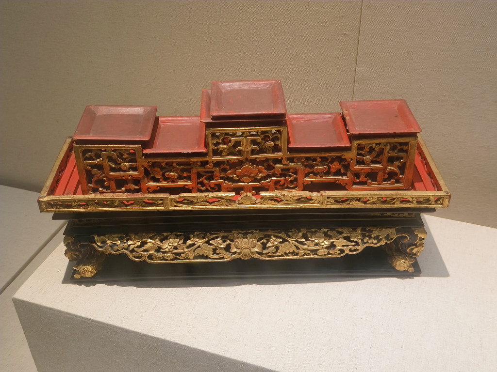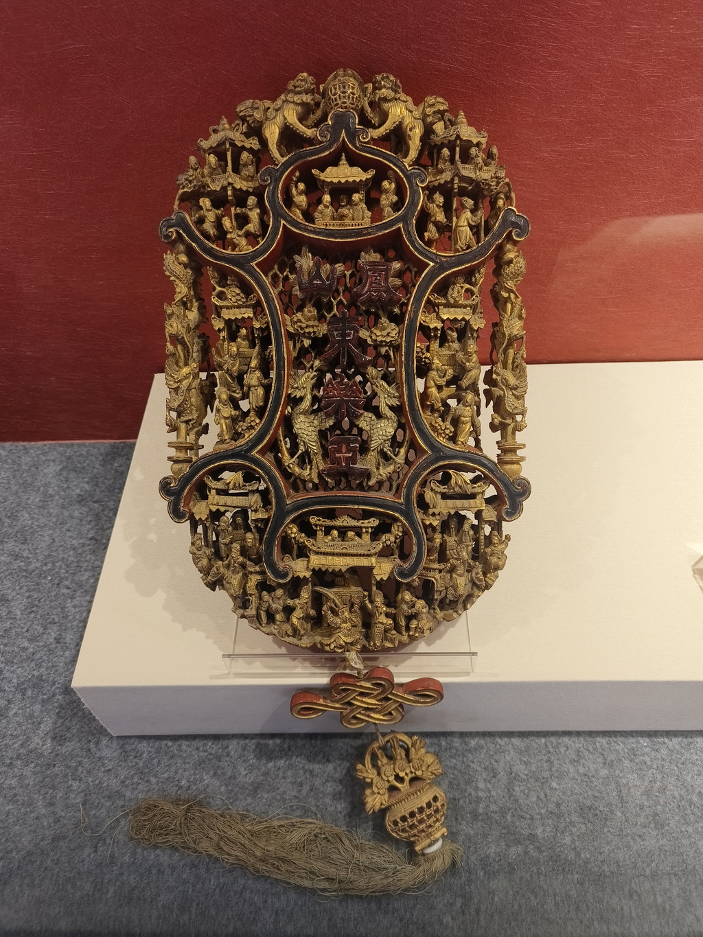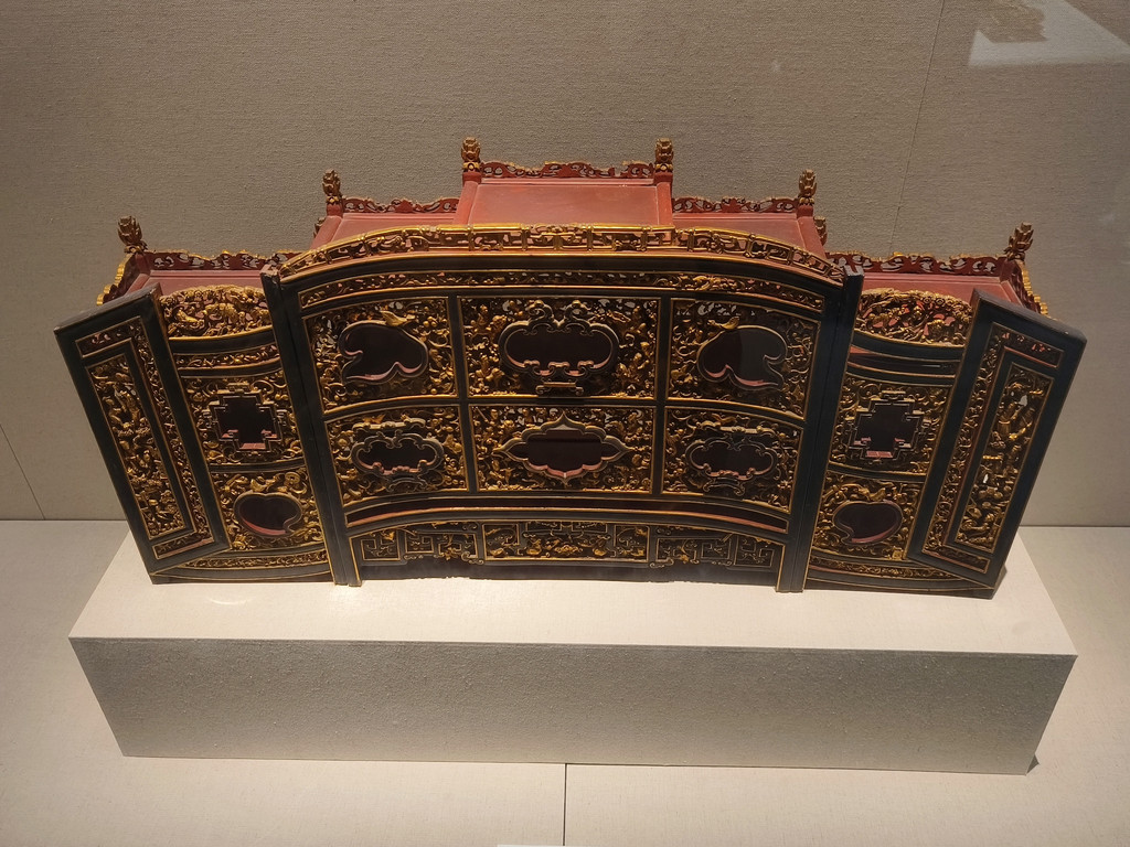 ↗金漆木雕人物博古纹神椟(清)。国家一级文物,镇馆之宝之一。神椟是潮汕地区供奉祖先牌位的一种神龛,多为柜式,大的称“龛”,小的称“椟”。这是迄今有明确纪年、年代最早的一件潮汕木雕神龛。