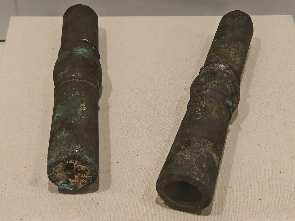 ↗“国姓府”铜铳(明末清初)。出水于广澳沉船遗址,铳身刻有“国姓府”,系郑成功水师使用的小型火炮。郑成功因南明隆武帝赐国姓“朱”,所以被尊称为国姓爷,以国姓府、国姓船、国姓壶等“国姓”为标志。