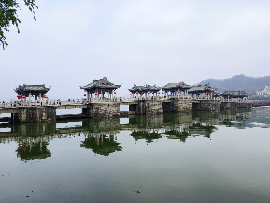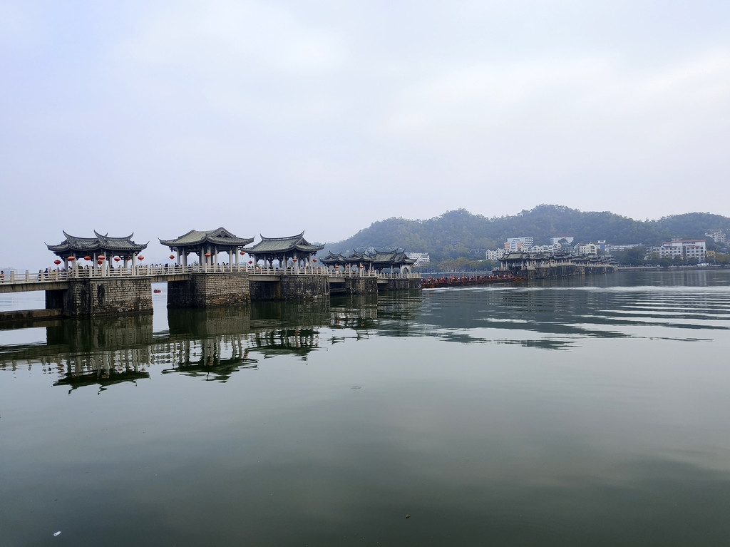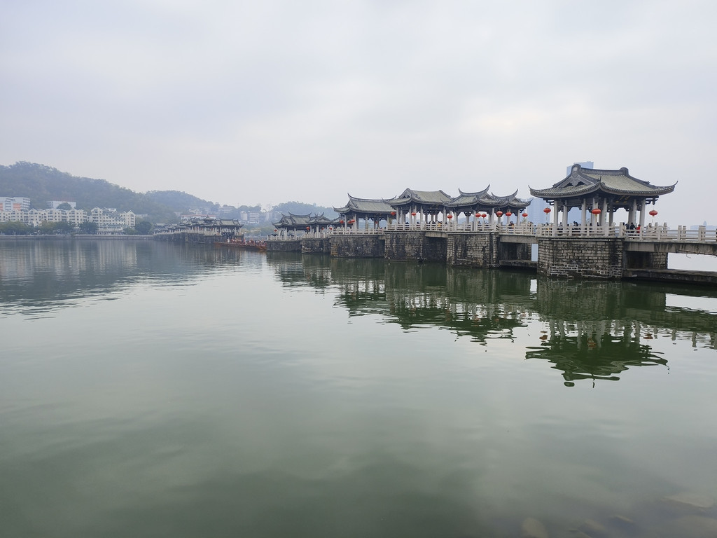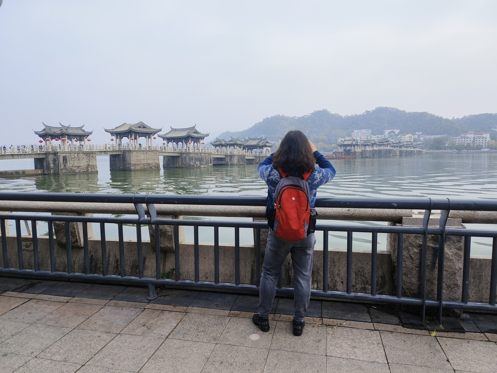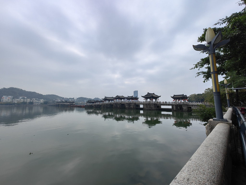距离产生美,广济桥还是远观比较好看。不过要有两个条件,一是要朝北看,南边不远处有高楼,煞风景;二是风平浪静时,倒影更美。