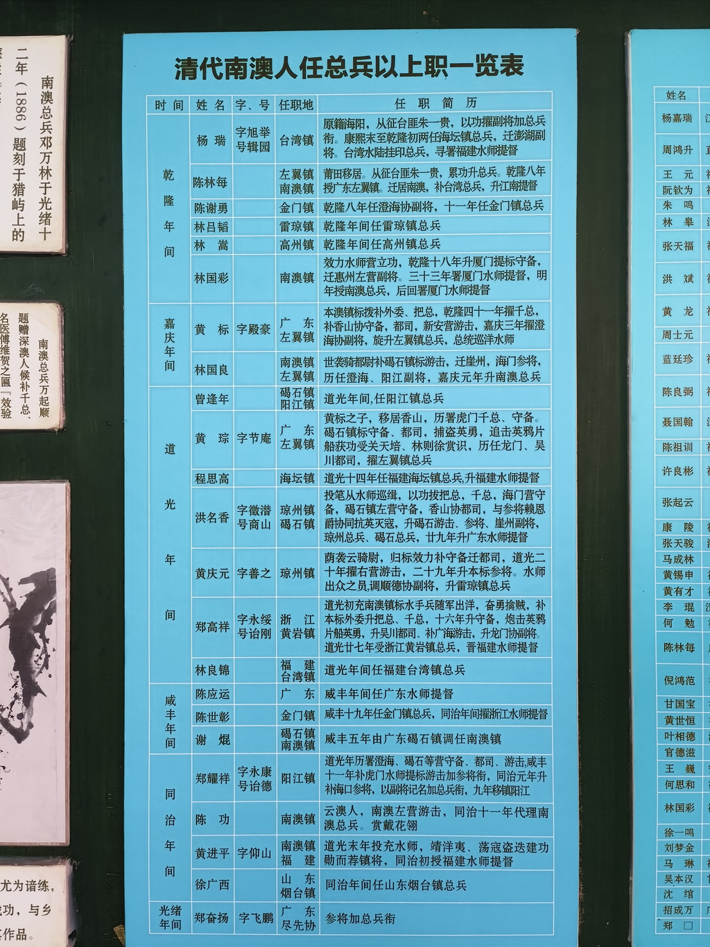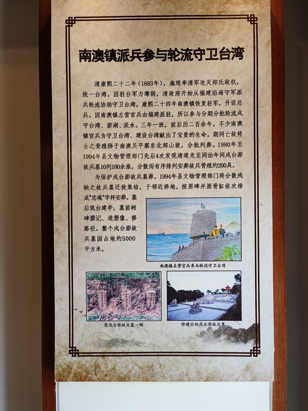 南澳地理位置重要,为抵御倭夷侵扰,打击海寇劫掠,1575年明朝设立“闽粤南澳镇”。这个“镇”,是一种军队建制单位,由总兵负责闽粤交界海面军务,为正二品大员。清康熙收复台湾后,南澳总兵还分批轮流参与守卫台湾、澎湖、淡水,三年一班,前后历二百余年。明清两朝共有177任、167名总兵和副总兵驻守这里,留下众多英雄的足迹。民族英雄刘永福曾两次任南澳总兵,郑成功更是以此为据点招兵练兵,最终收复台湾。