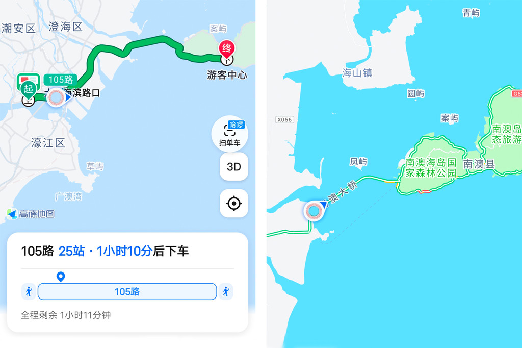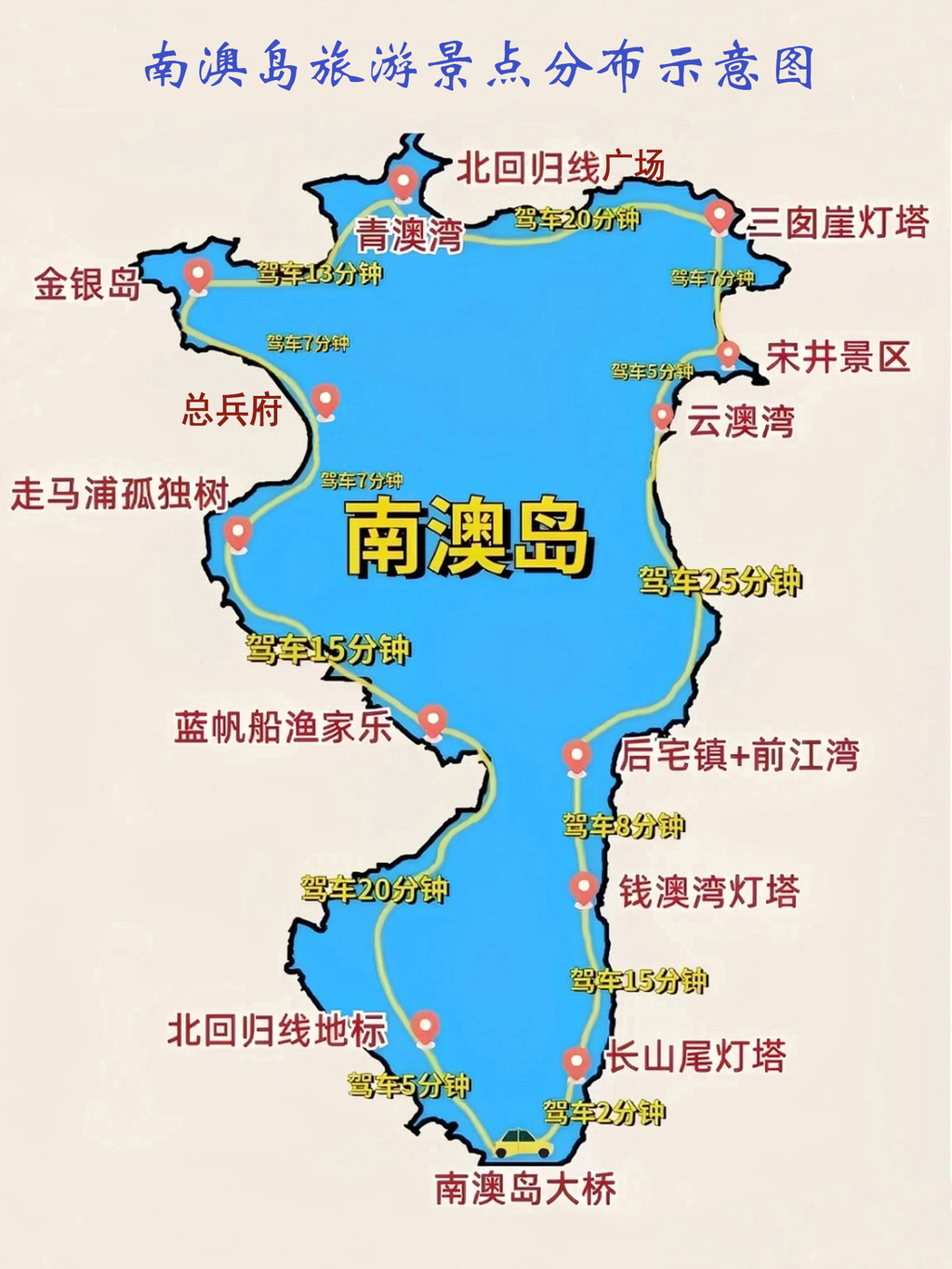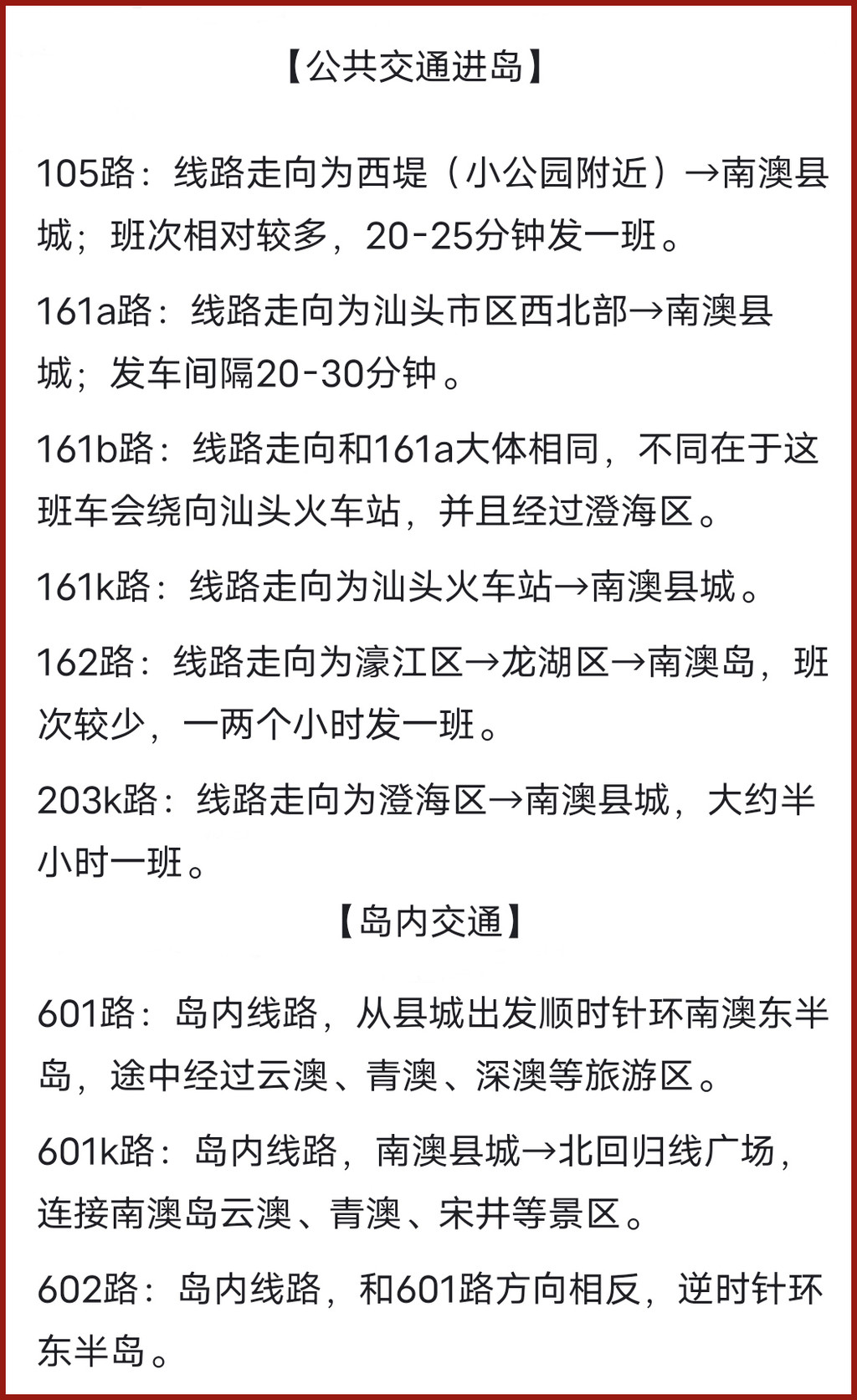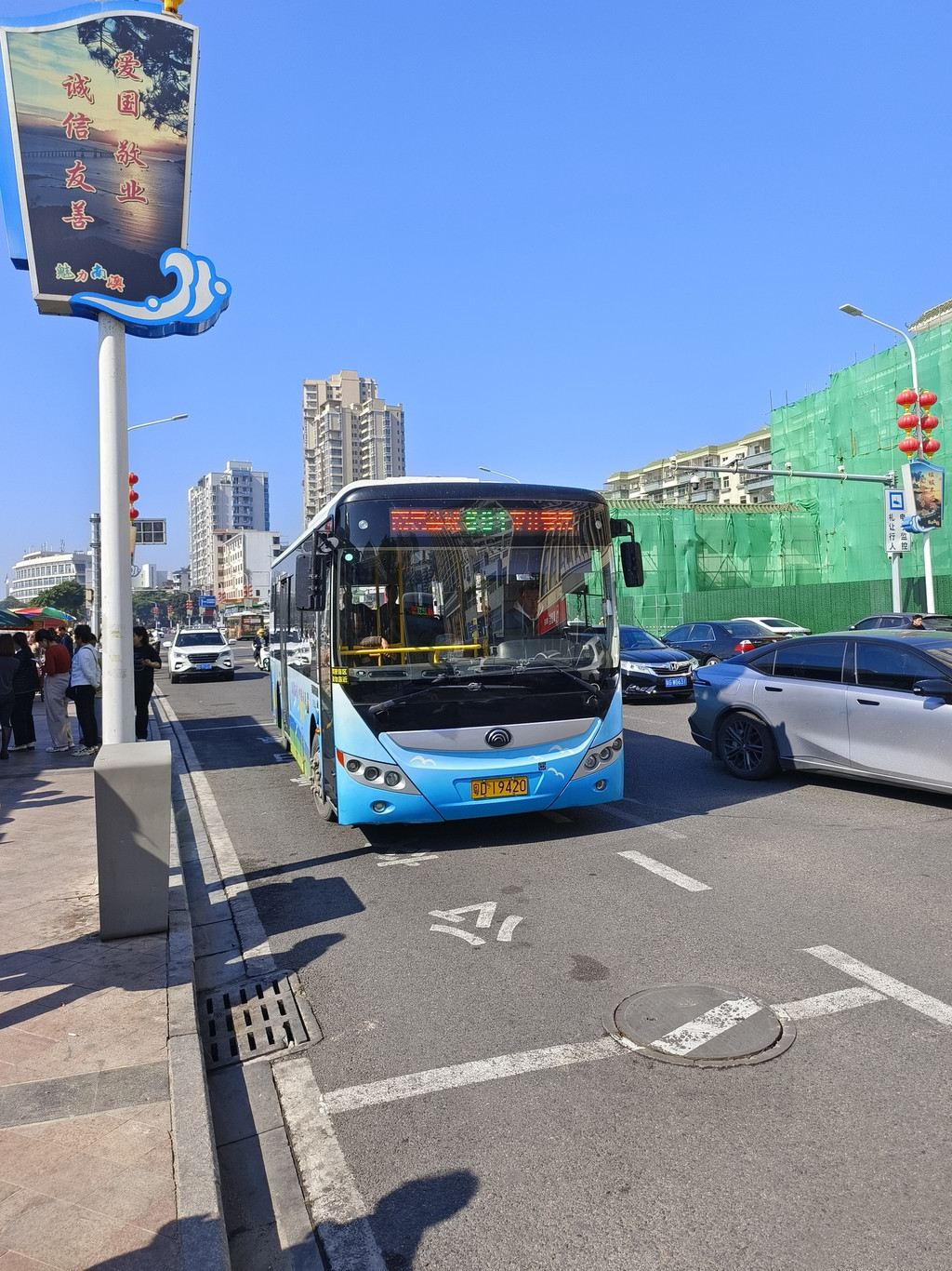 海岛景色是优美的,但往来道路是曲折的。南澳岛距汕头主城区约50千米,驾车需1个小时。多数人旅游选择跟团或包车,平时跟团每人150元左右,包车500元左右(含南澳岛大桥过桥费96元)。考虑到元旦假期价格更贵,这次我全程采用公共交通方式,公交105路进出岛,601、602路在岛内游玩。早上9点出发,晚上7点返回酒店,虽然花了一天时间,但感觉——值!计划中的青澳湾、北回归线广场、宋井、总兵府等海岛风光、人文历史都看到了,而且自由,想看多久就看多久,花费也少,车费、门票加起来不到100元。