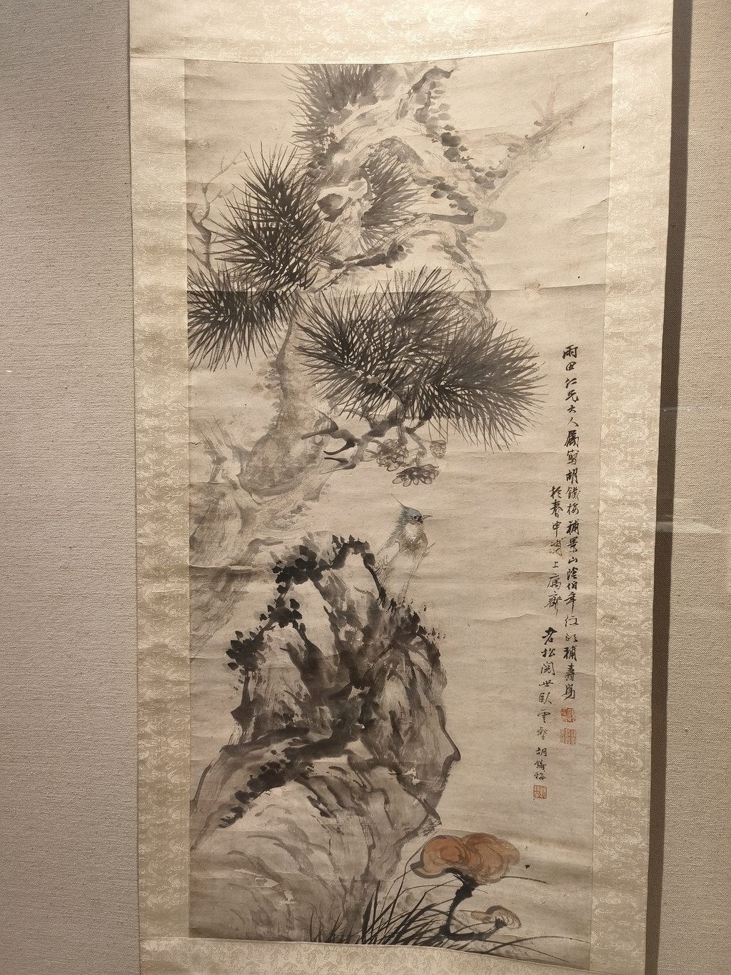↗任伯年胡铁梅松石寿鸟图轴(清)。任伯年,清末著名画家,技法全面,山水、花鸟、人物等无一不能;胡铁梅,清末画家,以画梅得名。
