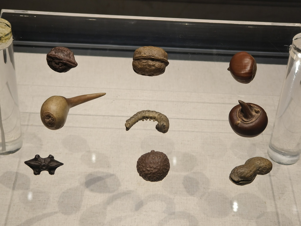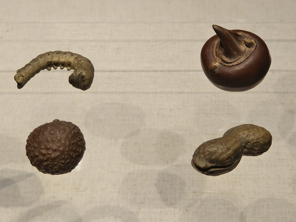 ↗紫砂摆件清供雅玩“八果一虫”(清)。国家一级文物,镇馆之宝之一。康雍年间紫砂名家陈鸣远制作。花生、核桃、胡桃、荸荠、板栗、菱角、慈菇、荔枝、蚕虫等九件作品,纹理清晰,造型逼真。