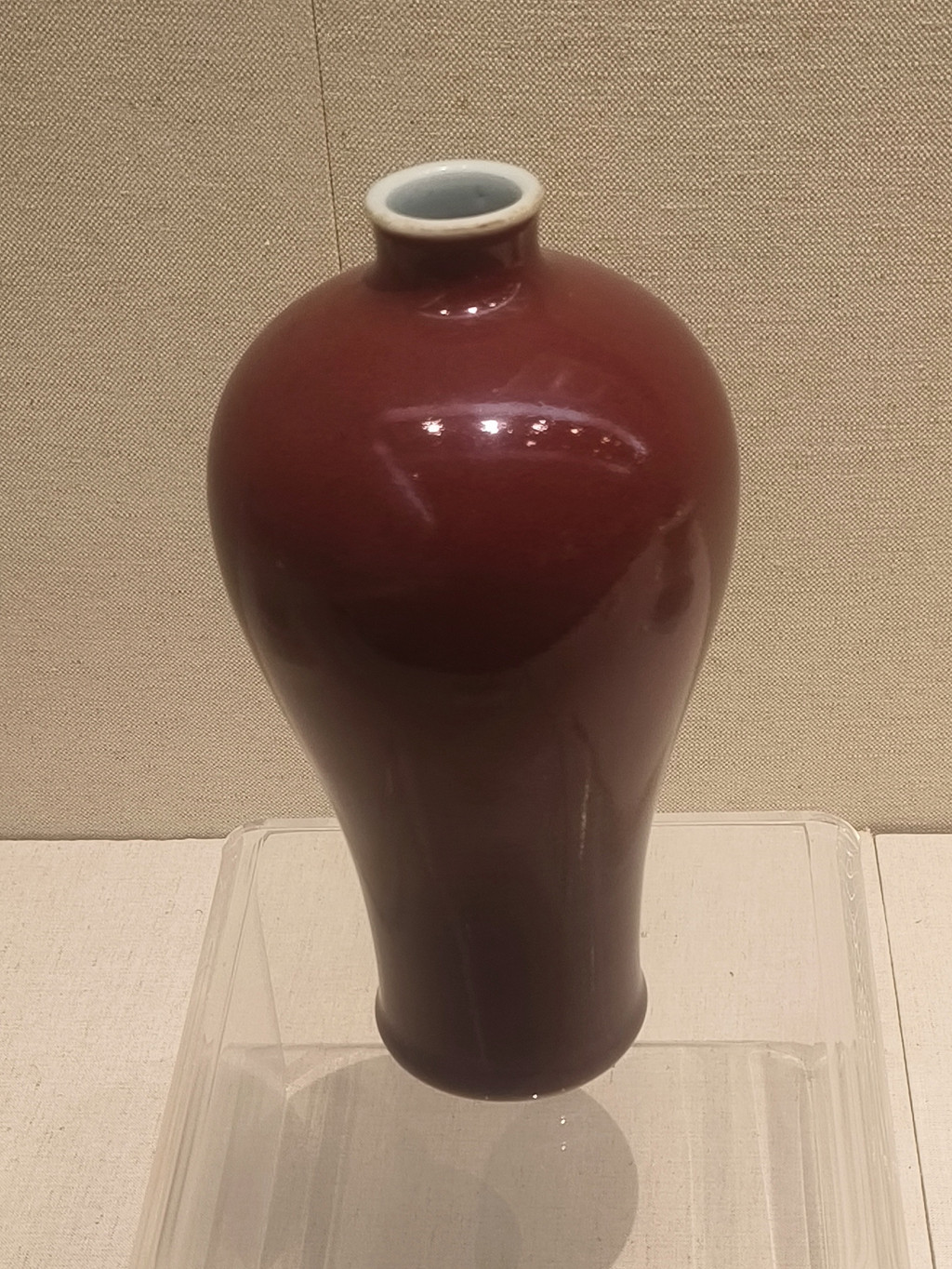↗景德镇窑霁红釉梅瓶(清)。“霁红”创烧于明早期,因作为皇帝御用礼敬天地日月,又名“祭红”。