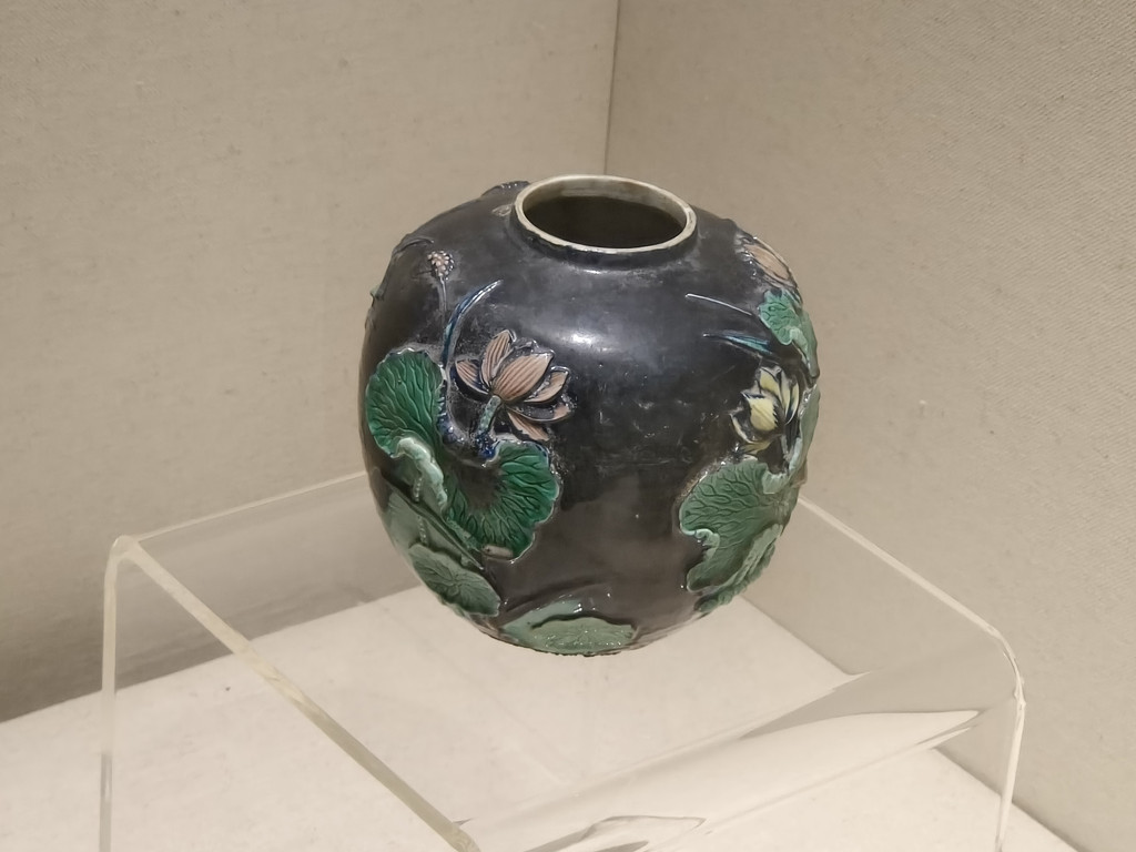 ↗“王炳荣作”雕瓷荷花罐(清)。王炳荣是清代同治光绪年间景德镇雕瓷名家。