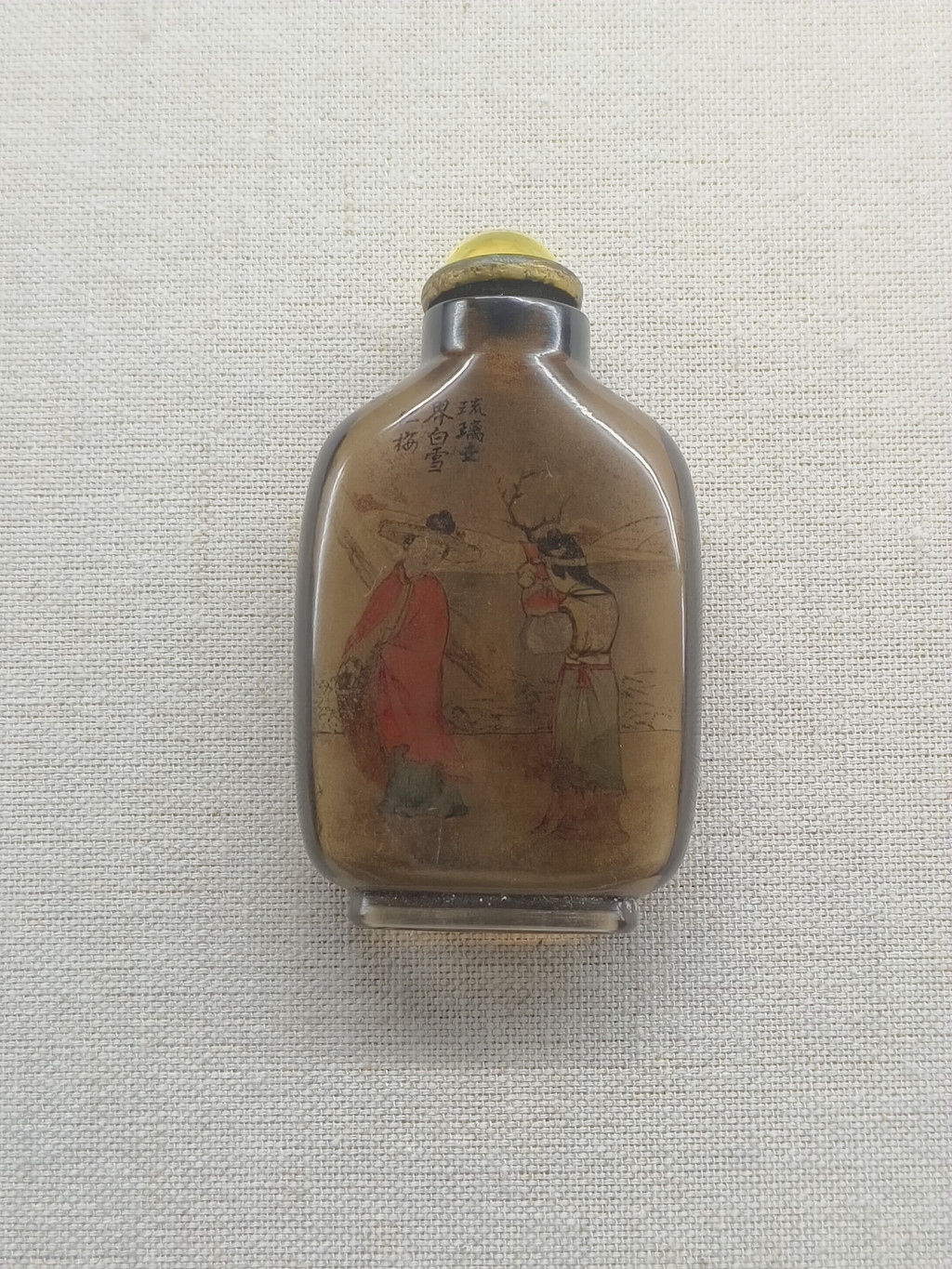 ↗茶晶“叶仲三”款内画人物故事鼻烟壶(民国)。叶仲三是清末民初京派内画四大名家之一。