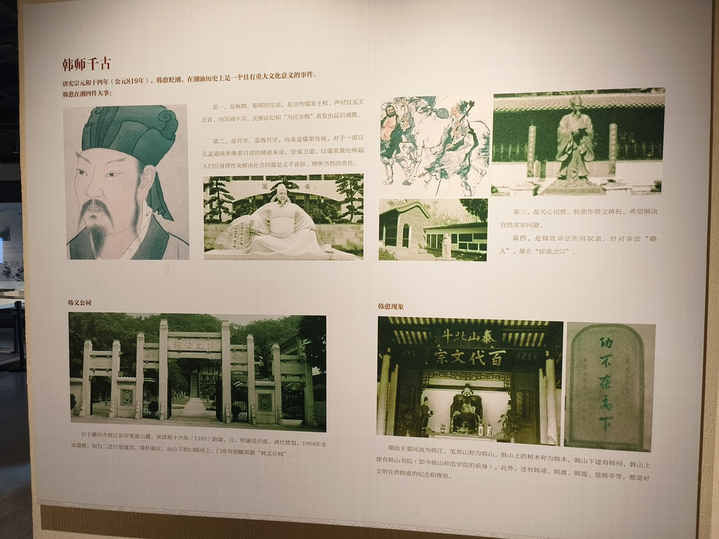 说到潮汕,必提韩愈。唐宪宗元和十四年(819)韩愈被贬潮州,在潮汕历史上是一个重大事件。他在任职7个多月的时间内做了四件事:一是杀鳄鱼,二是兴修水利,三是推广北方先进耕作技术,四是赎放奴婢,使当时的蛮荒之地发生了翻天覆地的变化,对潮州人民的民俗生活产生了深远影响。老百姓将他奉若神明,立祠纪念,还将祭鳄鱼的地方叫“韩埔”,渡口叫“韩渡”,大江叫“韩江”,江对面的山叫“韩山”。