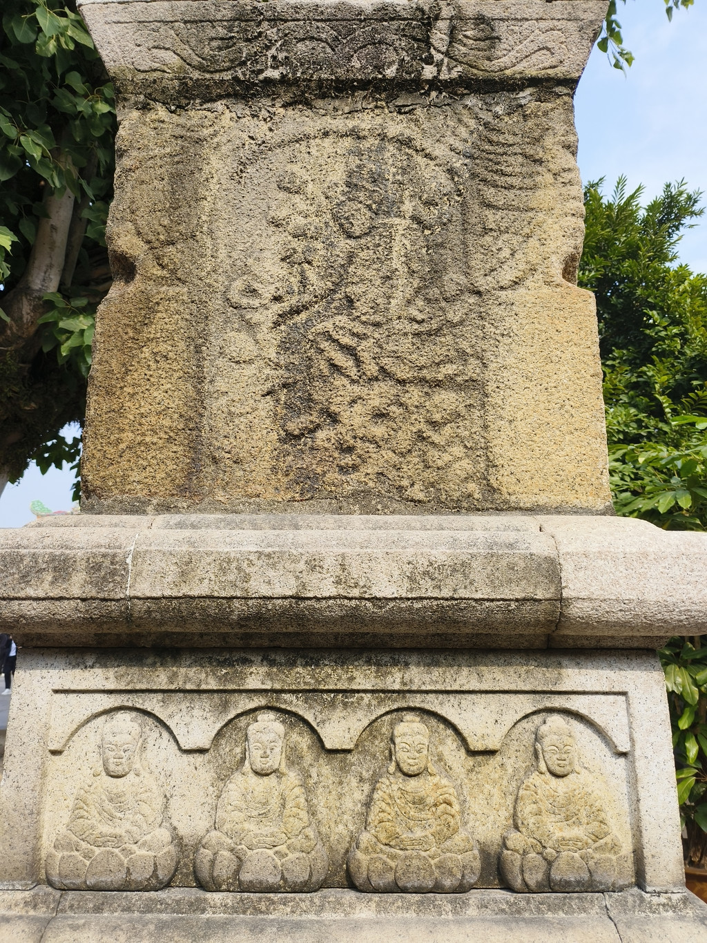 大雄宝殿前的宋代四大部洲石塔。四座方形阿育王式塔代表“四大部洲”,即东胜神洲、南赡部洲、西牛贺洲、北俱卢洲。