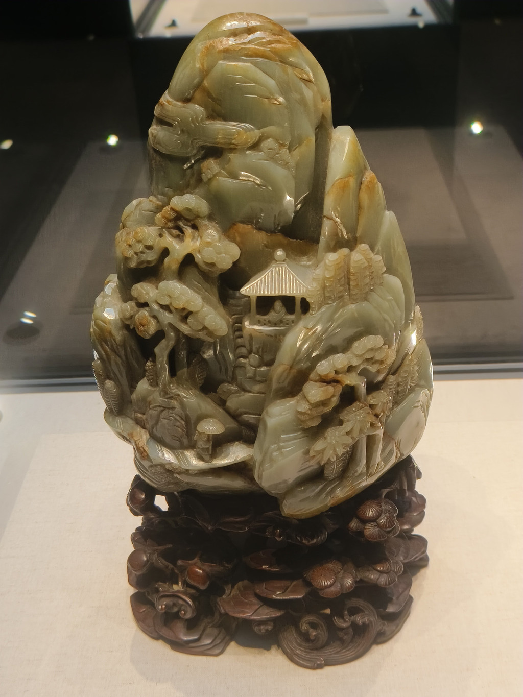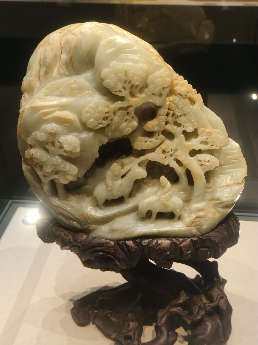 ↗秋山行旅图青玉山子(清)。国家一级文物。玉山子即圆雕山林景观。此件雕刻了一幅行旅图:险峻的山间小路上有两位骑马旅人,一骑停下喝水,一骑拾级而上,四周分布山石松树。