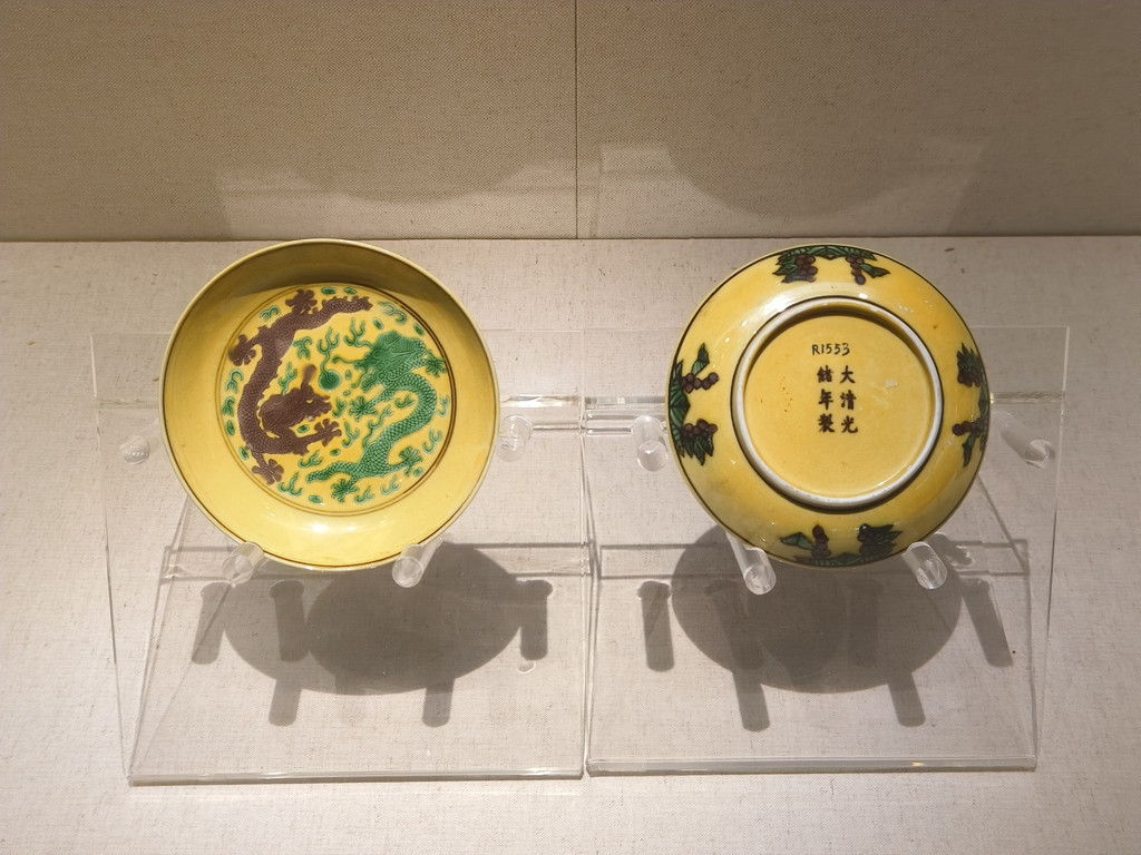 ↗光绪款黄釉紫绿彩龙纹碟(清)