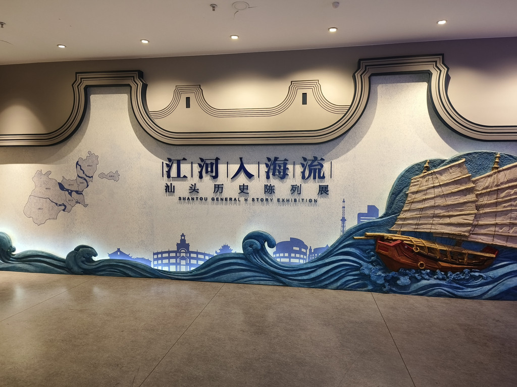 “江河入海流——汕头历史陈列展”以汕头发展历史为主线,从“象山曙光,浮滨遗风”、“海滨邹鲁,岭海名邦”、“海上门户,扬帆五洲”、“百载商埠,交汇鼎盛”、“特区拓路,试验新貌”五个部分,全面反映汕头的海洋文明、侨乡文化、商贸历史、风土人情与城市发展。
