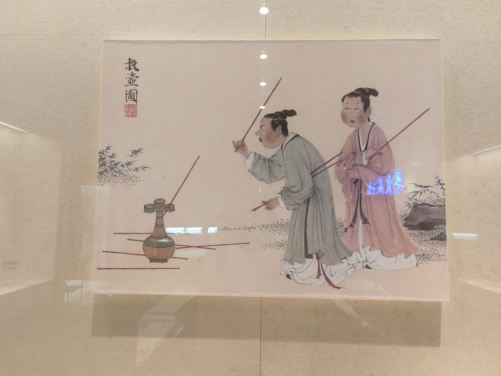投壶是古代宴会时的娱乐游戏,宾主依次投矢于壶中,以投中次数决定胜负。