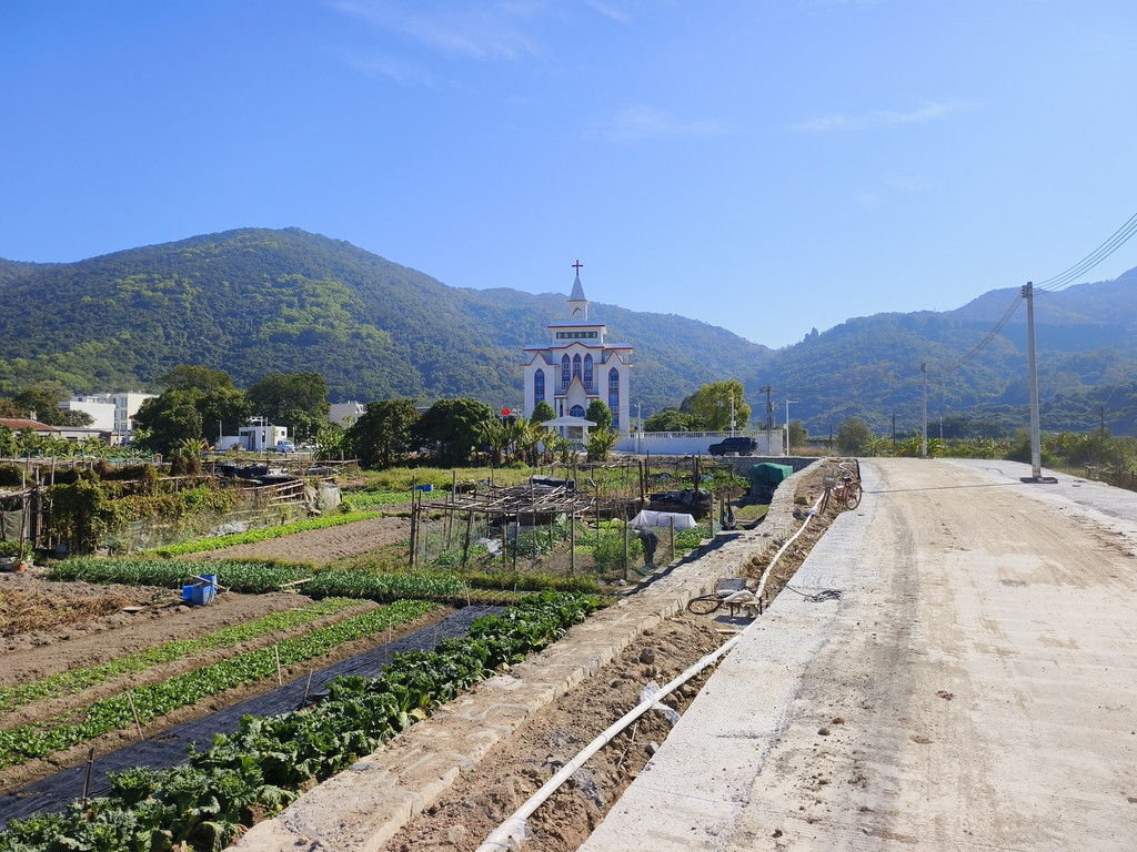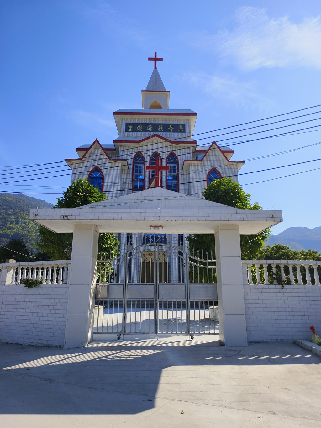 基督教深澳堂,背后是郁郁葱葱的山林,周围一片静谧。