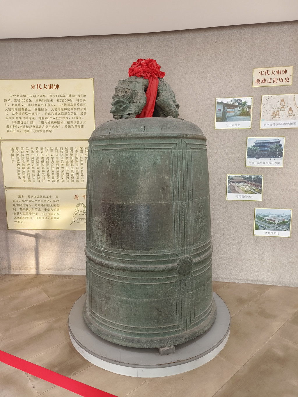 南宋海阳县资福寺大铜钟,位于主楼一层。国家一级文物,镇馆之宝。高219厘米,直径132厘米,周长414厘米,重约3000斤。宋绍兴四年(1134)铸造,钟钮部分为传说中的龙之四子蒲牢。