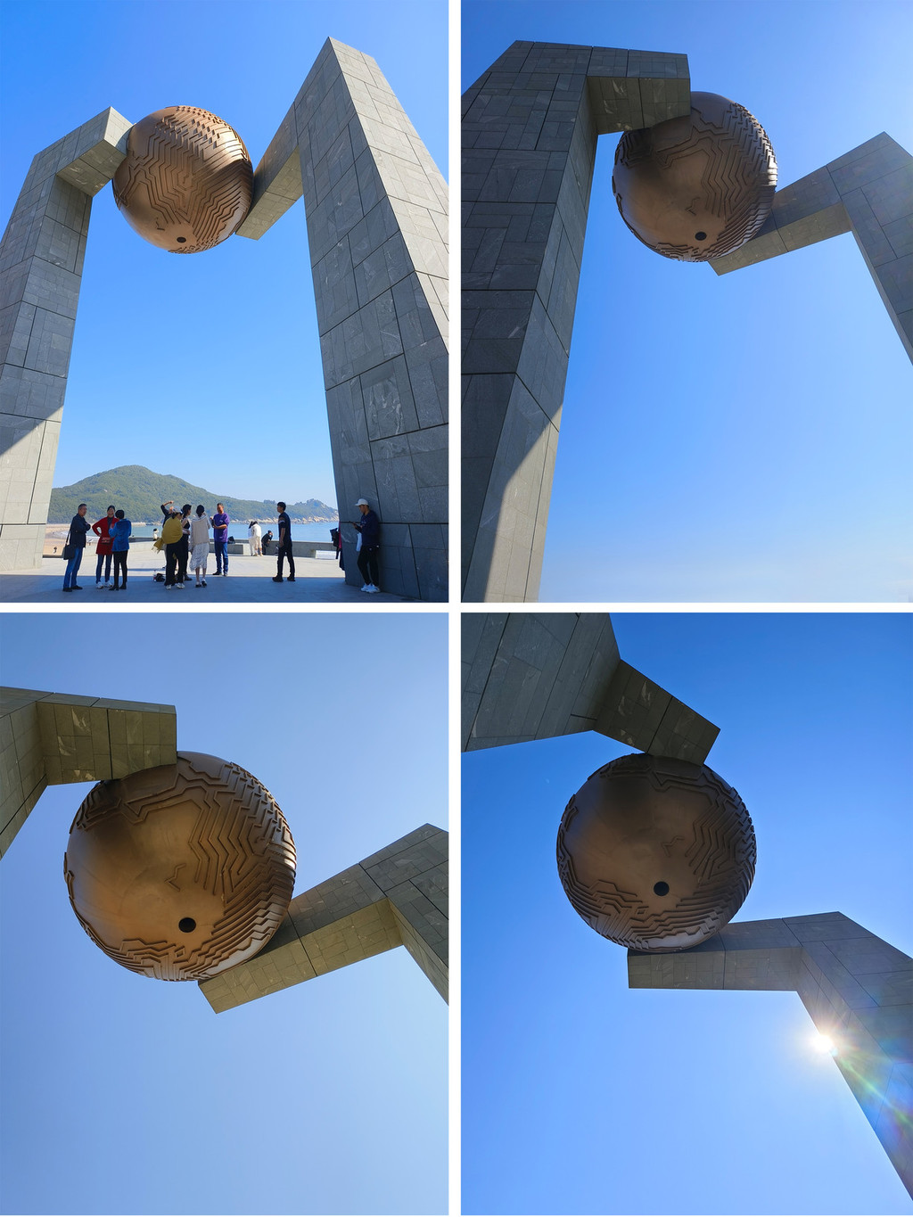 雕塑整体呈“门”字造型,球体半径3.21米(对应春分3月21日),悬臂长6.22米(对应夏至6月22日),底座到球体高12.22米(对应冬至12月22日),两边门柱倾斜角度对应北纬23.50(北回归线纬度)。每年夏至正午,当太阳直射北回归线时,日影穿过上方圆球中心圆管,投射地台中央。如果你正好在现场,将会看到“立竿不见影”的奇观,只有一个点,而没有常见的“影”。