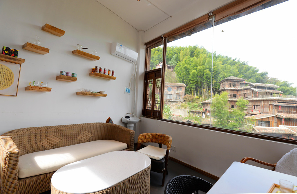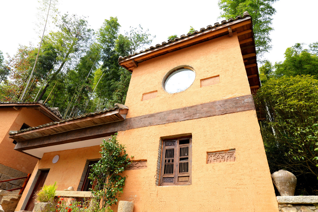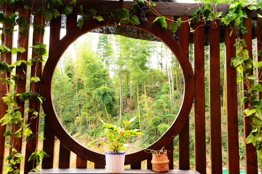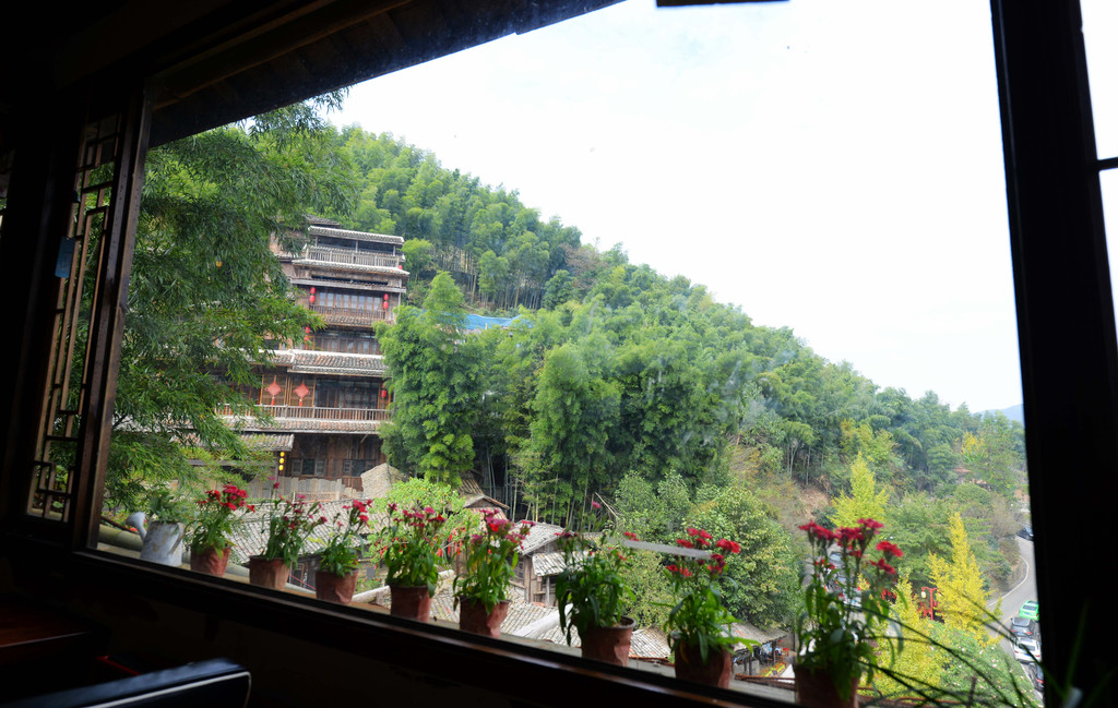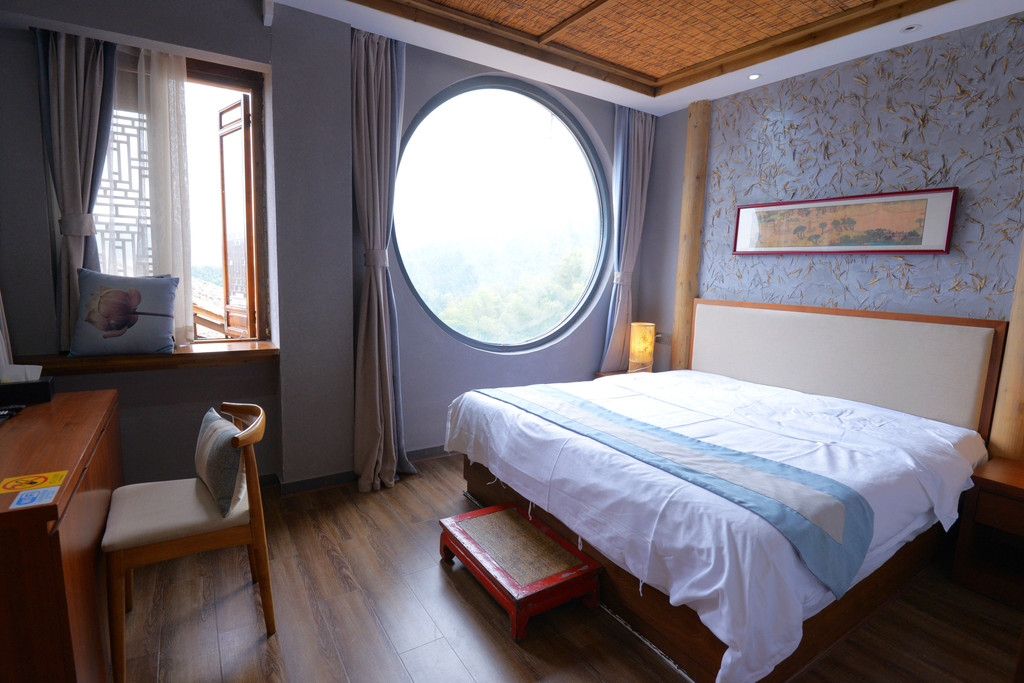 “一尘山舍”座落在山顶上,窗外翠竹摇曳,飞鸟相逐,霞光云飞,房内空间雅致,花窗古朴,睡在竹海间,住在情怀里。