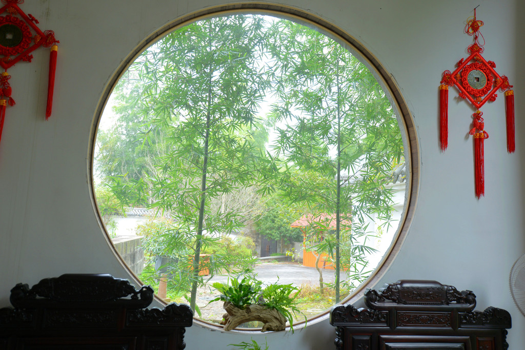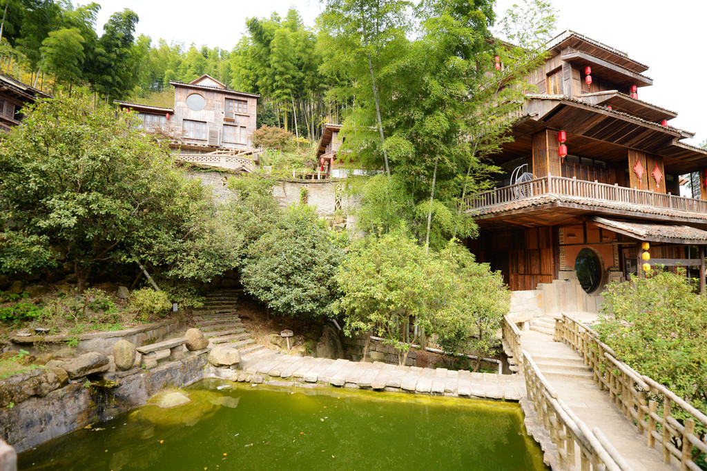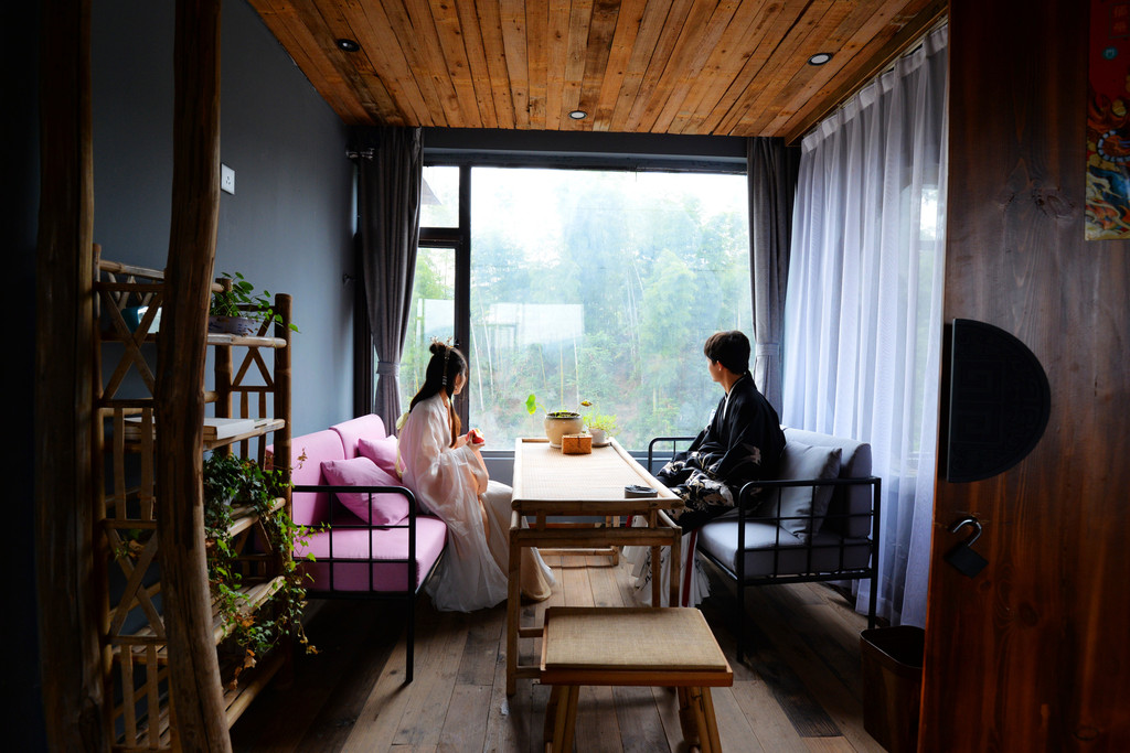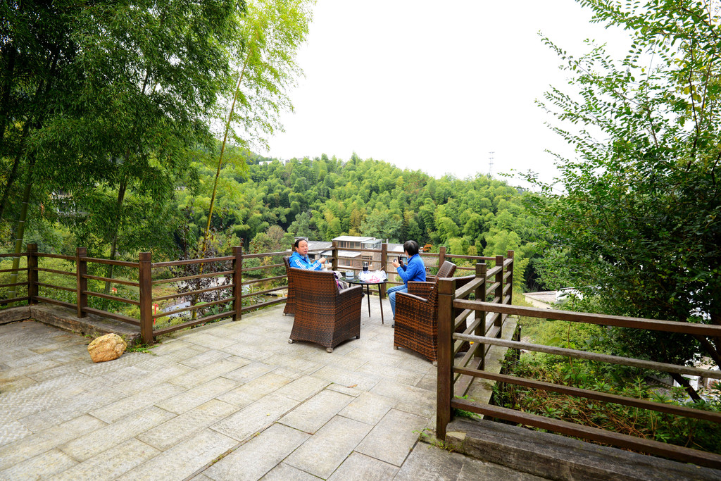 “一尘山舍”座落在山顶上,窗外翠竹摇曳,飞鸟相逐,霞光云飞,房内空间雅致,花窗古朴,睡在竹海间,住在情怀里。