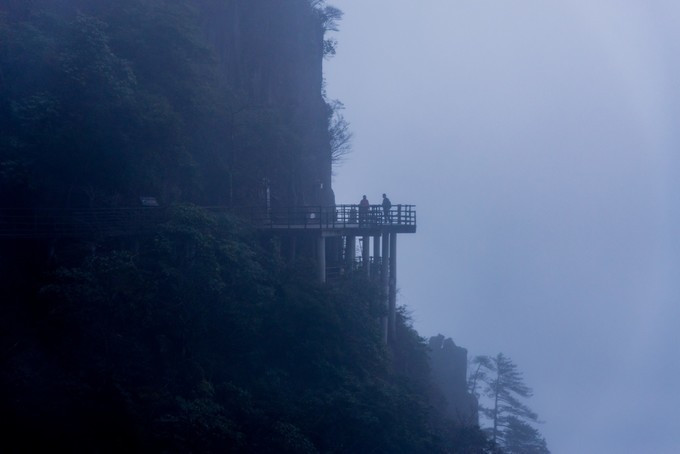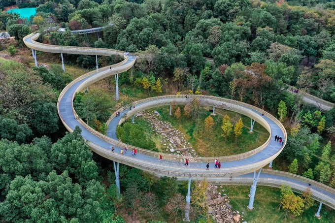 从上帝视角俯视,不少游客行走在森林步道上。步道蜿蜒盘山而上,叠翠群峰,盘旋辗转,据说采用的是钢架镂空设计,是 江西 唯一的钢架镂空步道。