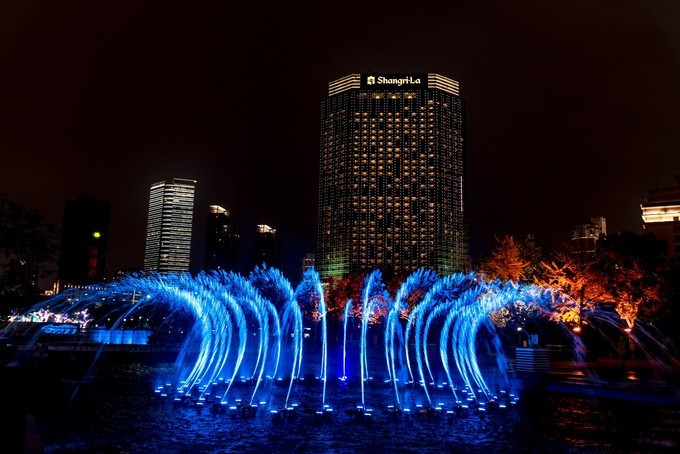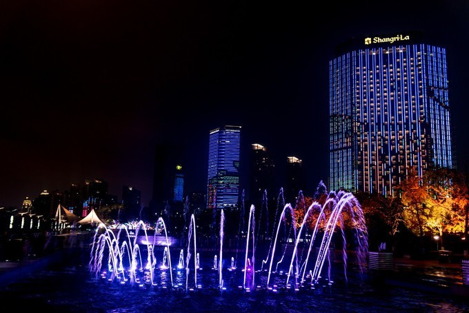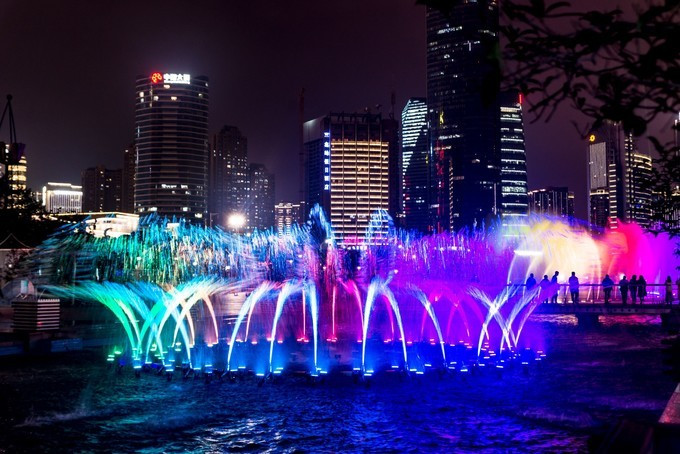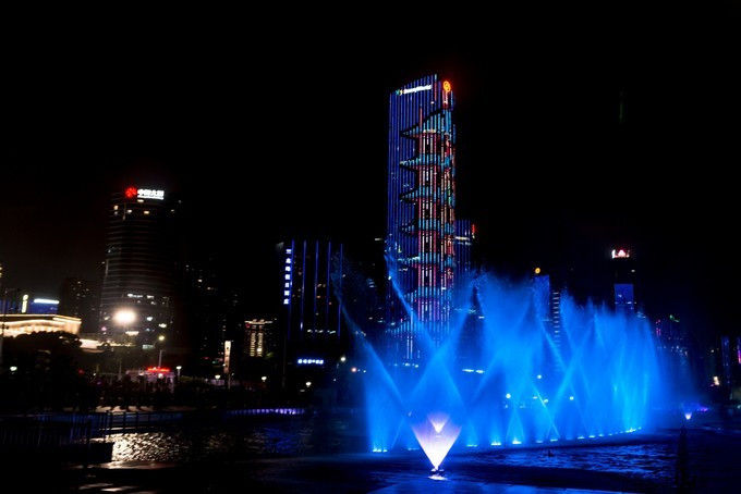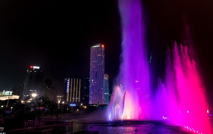 音乐喷泉就在秋水广场的中心地带, 临江 建有一处长280米、宽25米的大型江边悬挑平台,设置有露天看台,配置了22个水喷景观,水景长达800米,共装有1600多个喷头,其中主喷高达128米,是 亚洲 最高的喷泉。喷泉通过高科技的组合,使声、光、电各项元素交相辉映,变幻万千。有华尔兹、光芒四射、长虹卧波、孔雀开屏等多种水型。灯光不但亮度高,还能上下左右摆动、变换七种颜色,照射出各种图案。